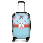 This Airplane themed design features a little pilot in his own plane with his name just below it within a red and yellow frame. The design also features planes in the sky above and blue chevron stripes below with a red stripe to tie it all together.