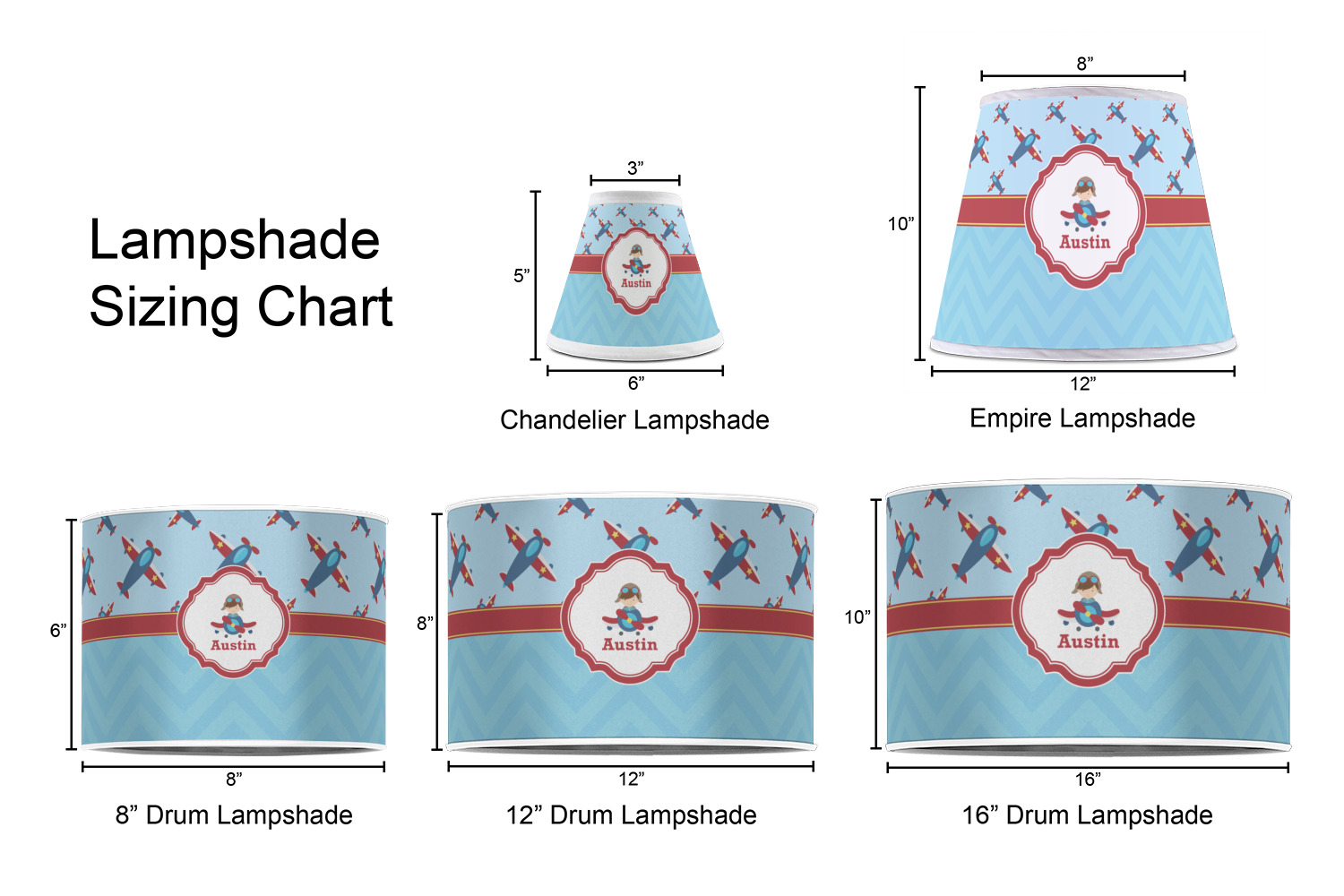 Our customized lamp shades also come in 3 different sizes: 8", 12" and 16", measuring at 8" in diameter by 6" tall, 12" in diameter by 8" tall, and 16" in diameter by 10" tall, respectively.