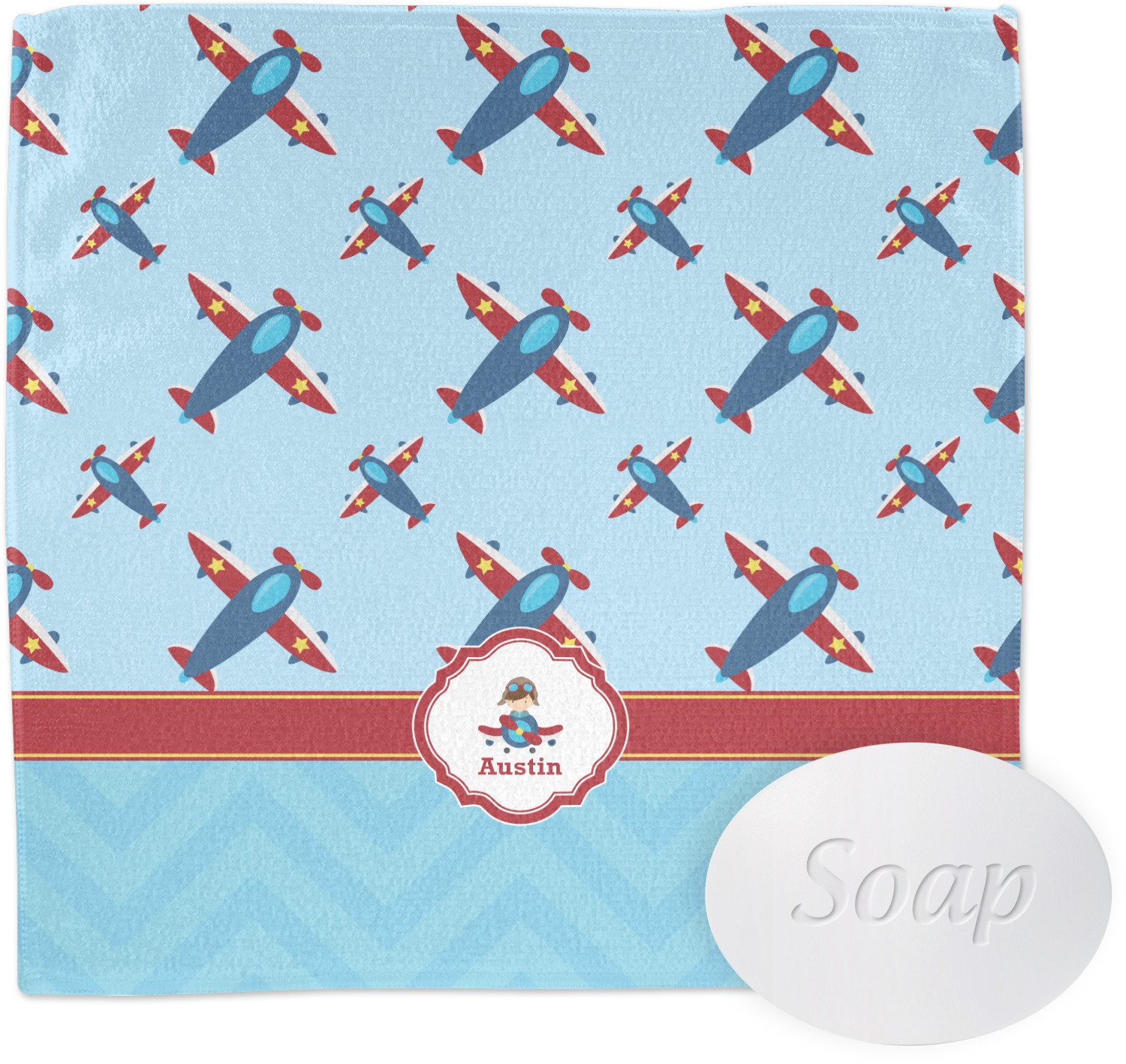 This Airplane themed design features a little pilot in his own plane with his name just below it within a red and yellow frame. The design also features planes in the sky above and blue chevron stripes below with a red stripe to tie it all together.