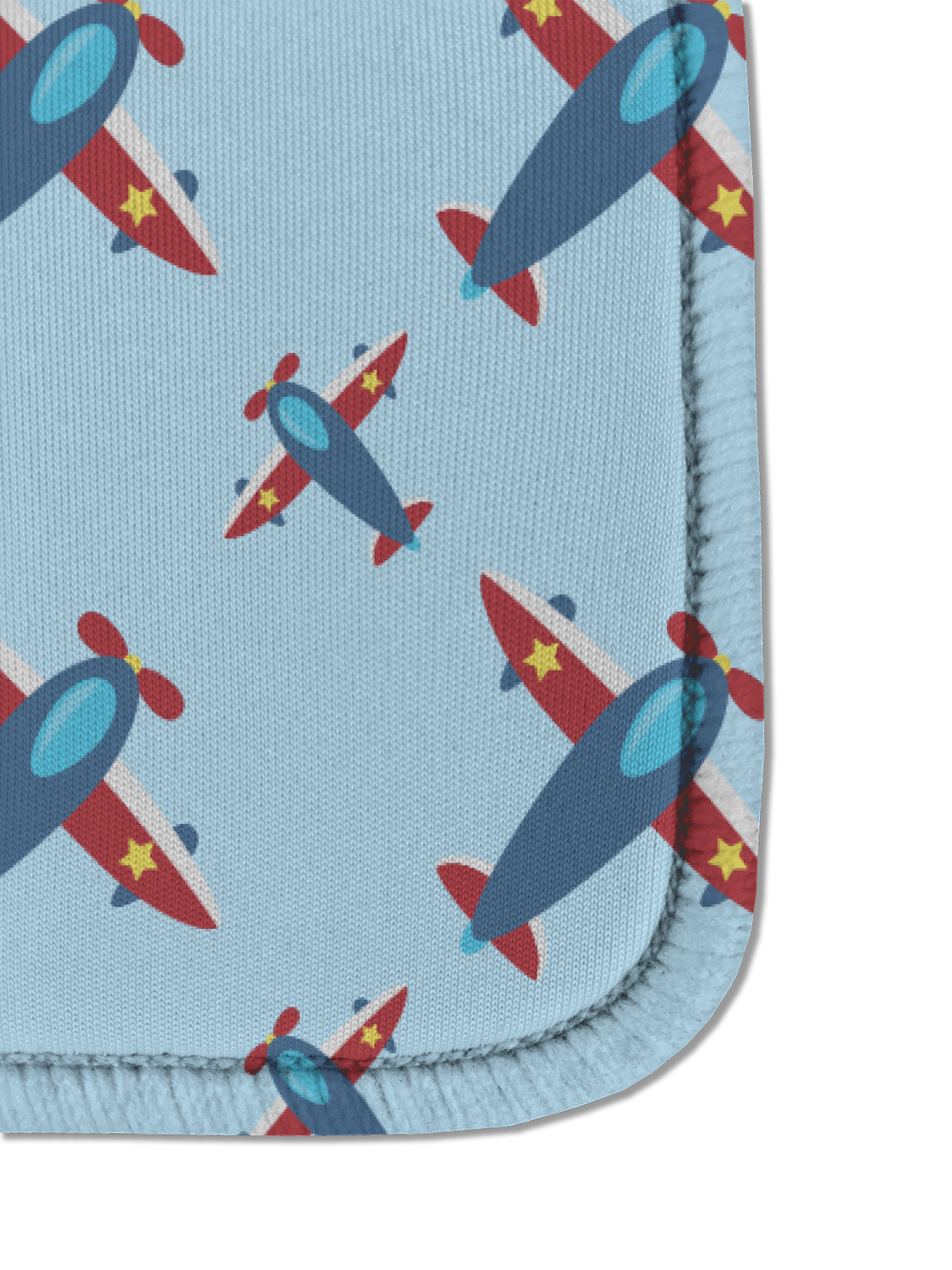 This Airplane themed design features a little pilot in his own plane with his name just below it within a red and yellow frame. The design also features planes in the sky above and blue chevron stripes below with a red stripe to tie it all together.