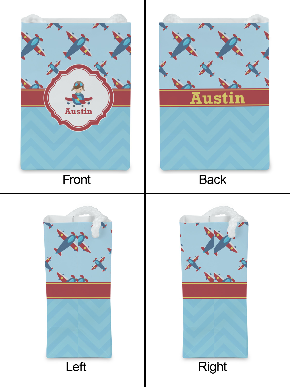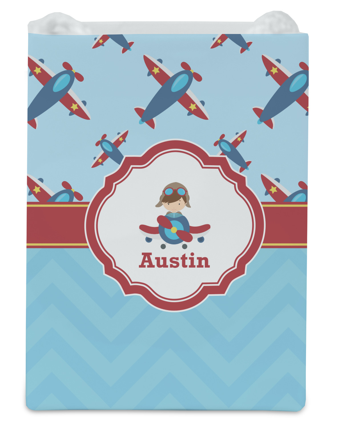 This Airplane themed design features a little pilot in his own plane with his name just below it within a red and yellow frame. The design also features planes in the sky above and blue chevron stripes below with a red stripe to tie it all together.