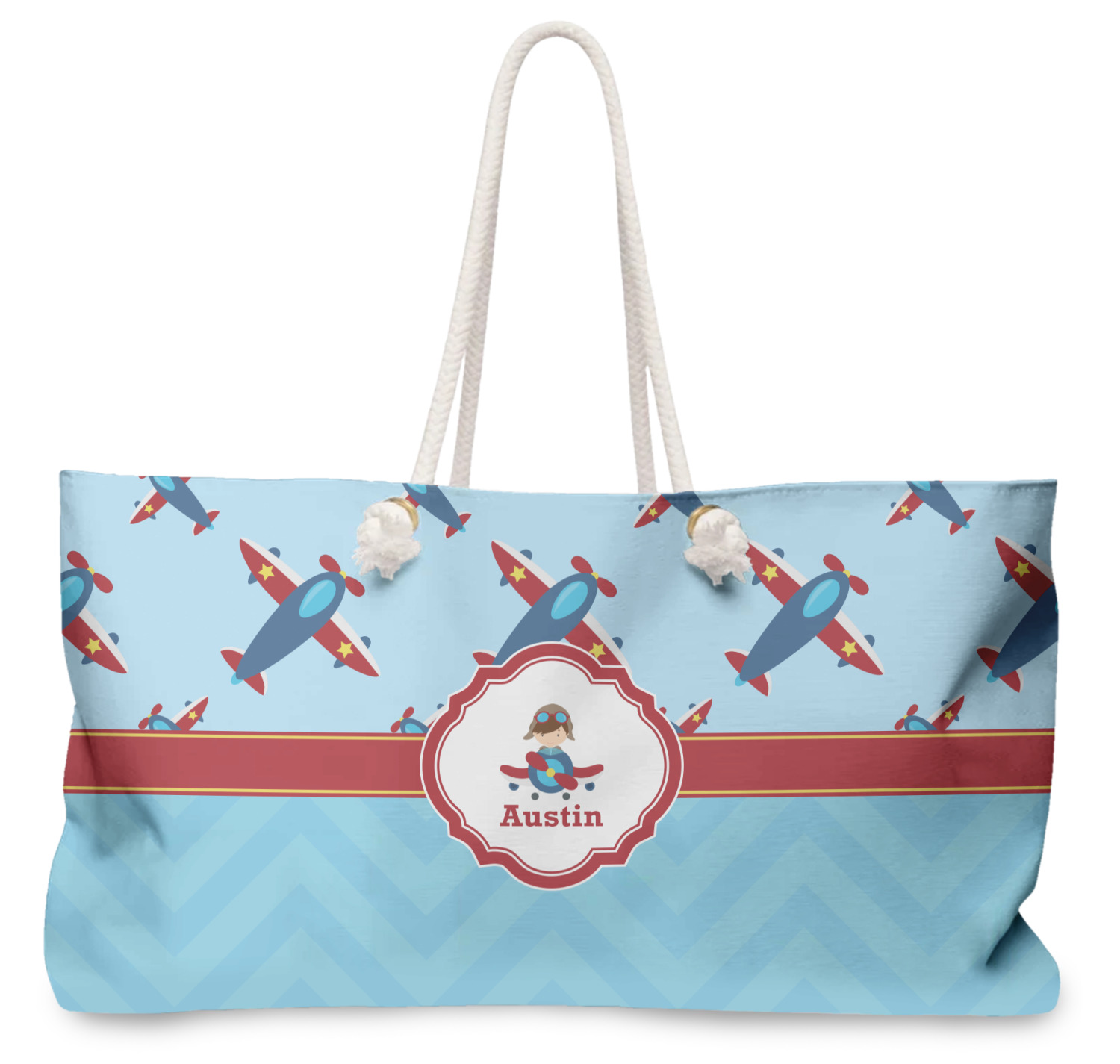 Our oversized weekender tote with rope handles is perfect for your weekend at the beach or on the town. This large tote are 24" W X 13" H, with a 5" gusset and a 27" thick rope handles with a knot that is put through a grommeted brass hole.