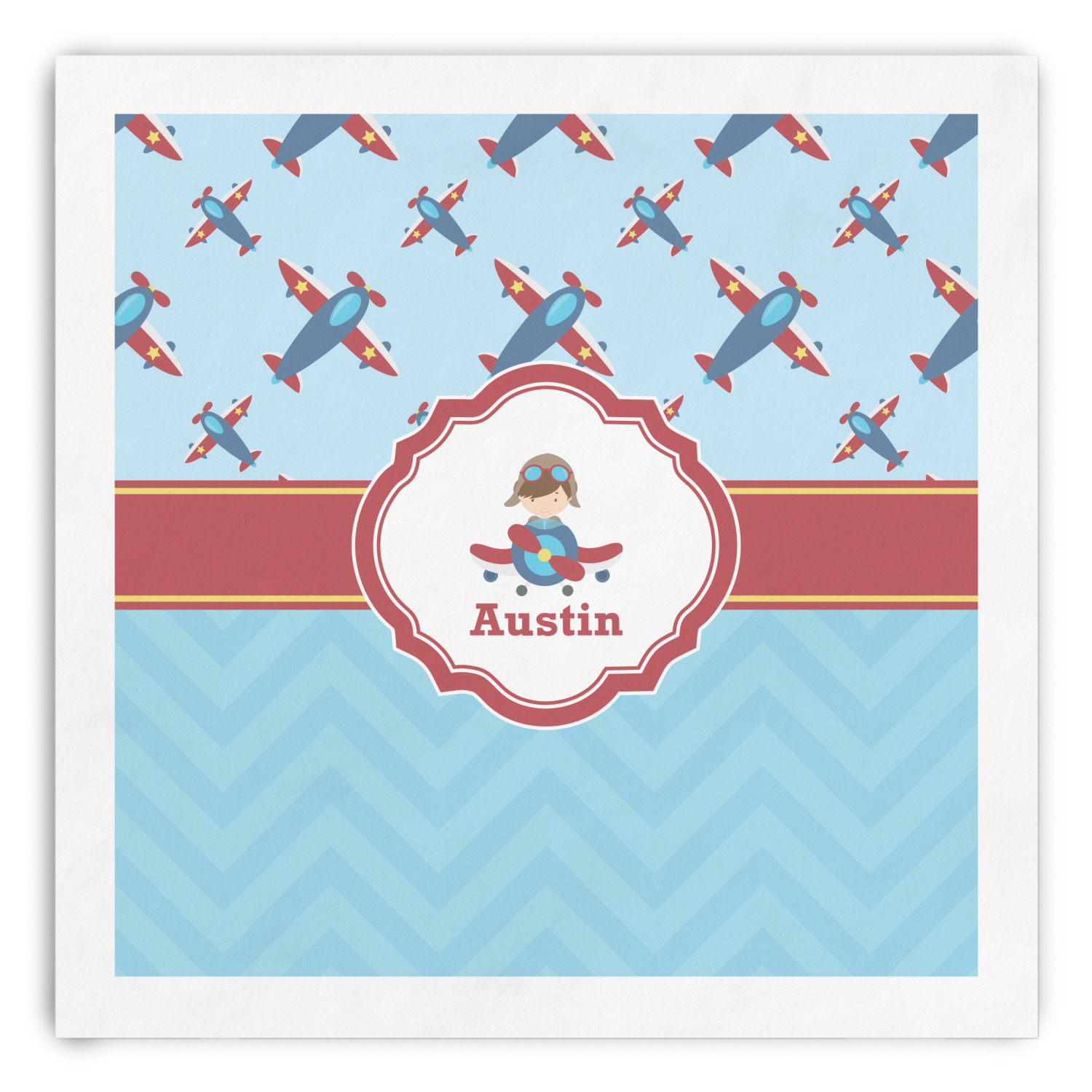 This Airplane themed design features a little pilot in his own plane with his name just below it within a red and yellow frame. The design also features planes in the sky above and blue chevron stripes below with a red stripe to tie it all together.
