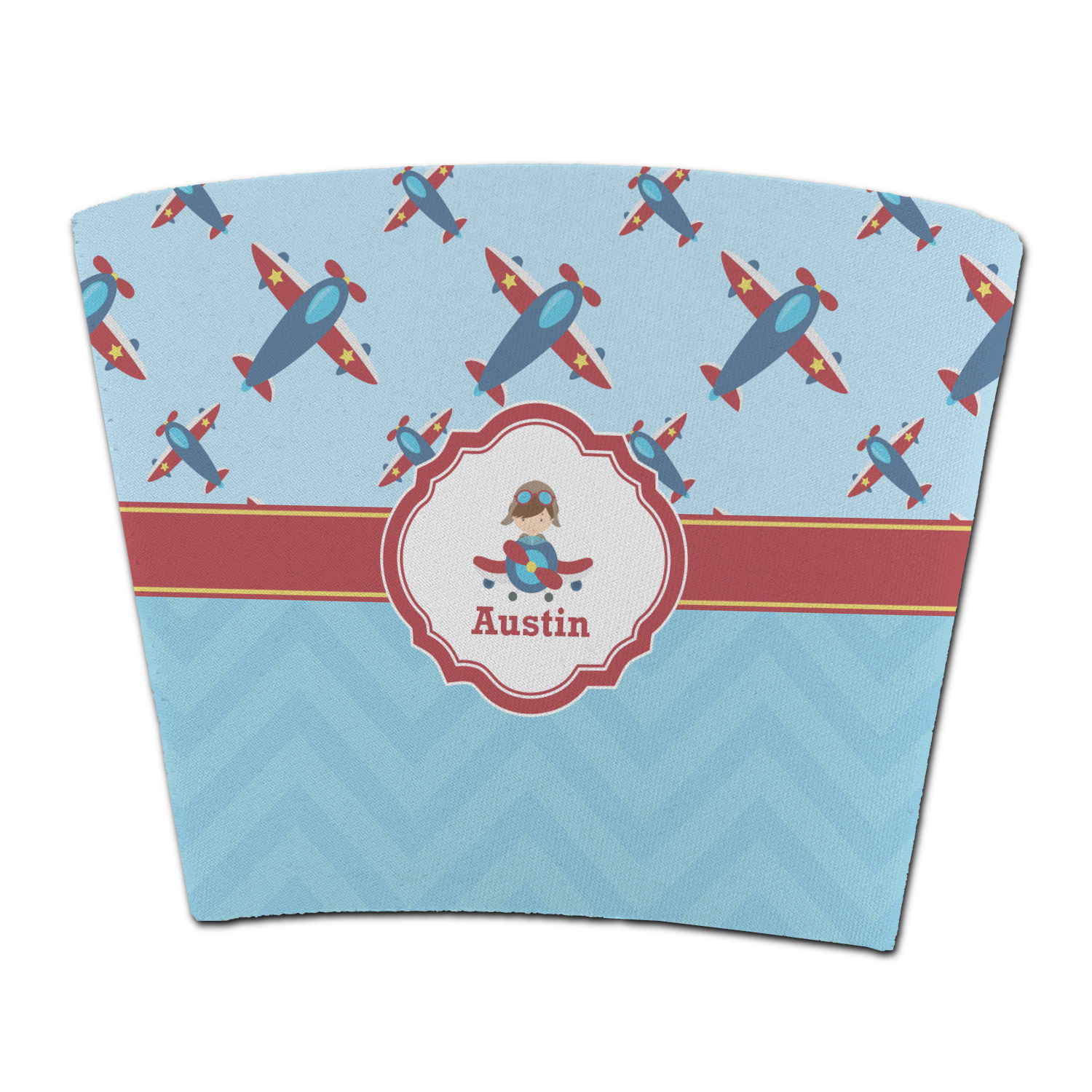 This Airplane themed design features a little pilot in his own plane with his name just below it within a red and yellow frame. The design also features planes in the sky above and blue chevron stripes below with a red stripe to tie it all together.