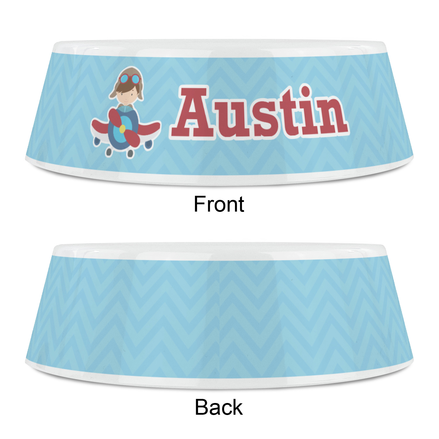 This Airplane themed design features a little pilot in his own plane with his name just below it within a red and yellow frame. The design also features planes in the sky above and blue chevron stripes below with a red stripe to tie it all together.