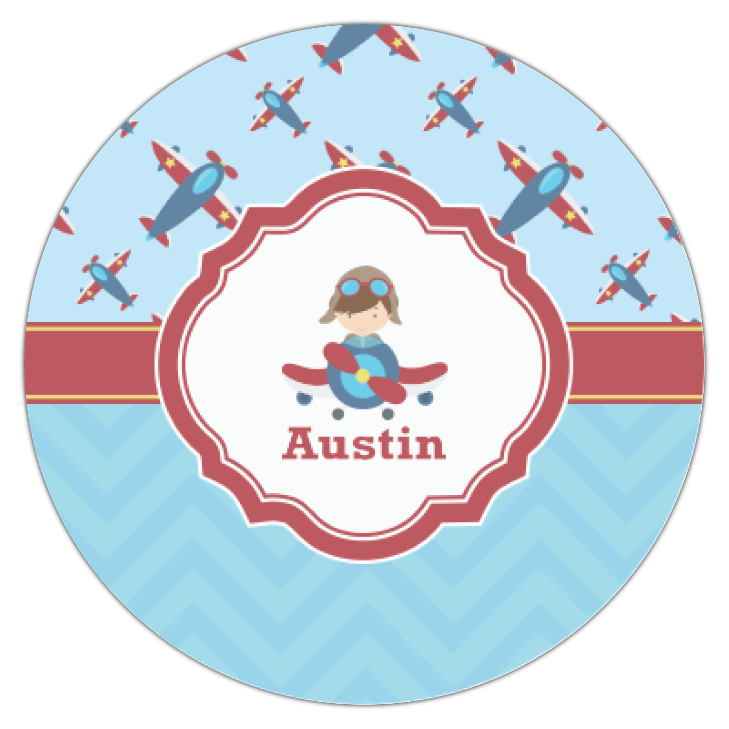 This Airplane themed design features a little pilot in his own plane with his name just below it within a red and yellow frame. The design also features planes in the sky above and blue chevron stripes below with a red stripe to tie it all together.