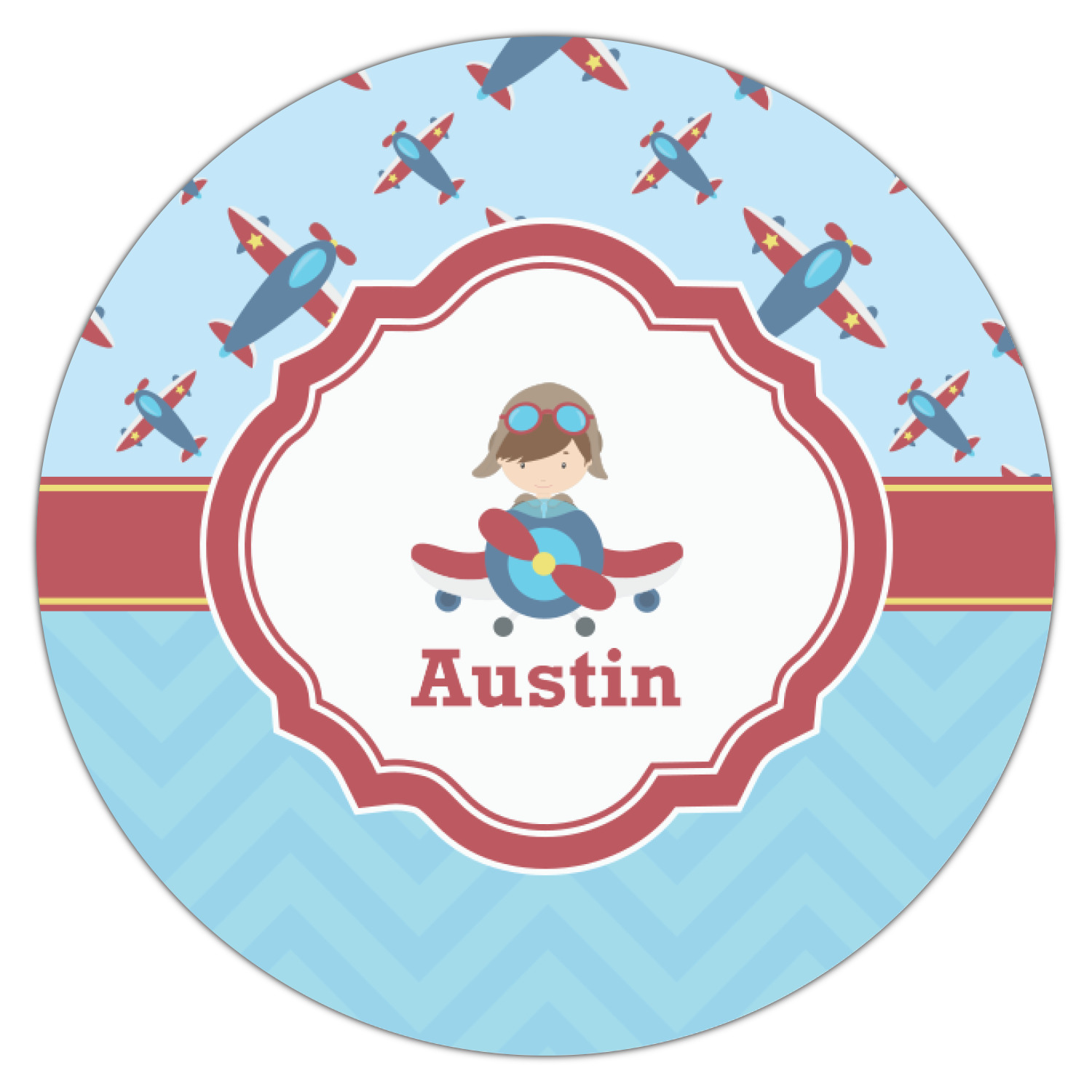 This Airplane themed design features a little pilot in his own plane with his name just below it within a red and yellow frame. The design also features planes in the sky above and blue chevron stripes below with a red stripe to tie it all together.