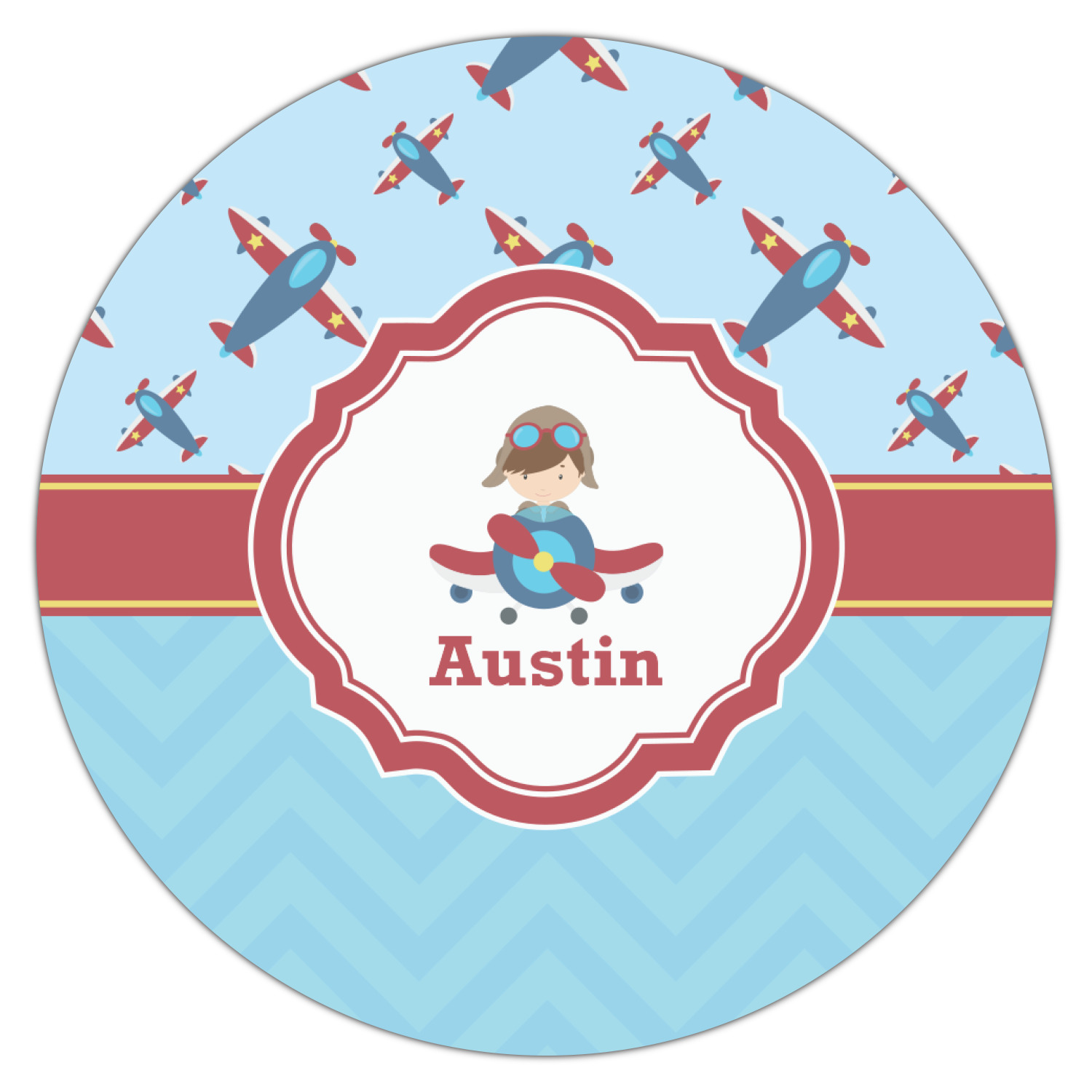 This Airplane themed design features a little pilot in his own plane with his name just below it within a red and yellow frame. The design also features planes in the sky above and blue chevron stripes below with a red stripe to tie it all together.