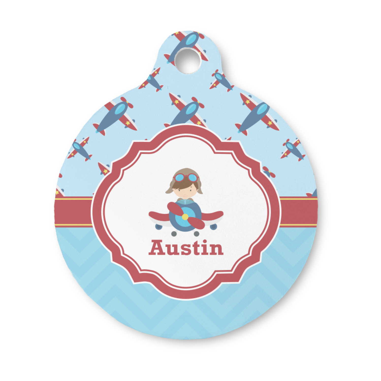 This Airplane themed design features a little pilot in his own plane with his name just below it within a red and yellow frame. The design also features planes in the sky above and blue chevron stripes below with a red stripe to tie it all together.