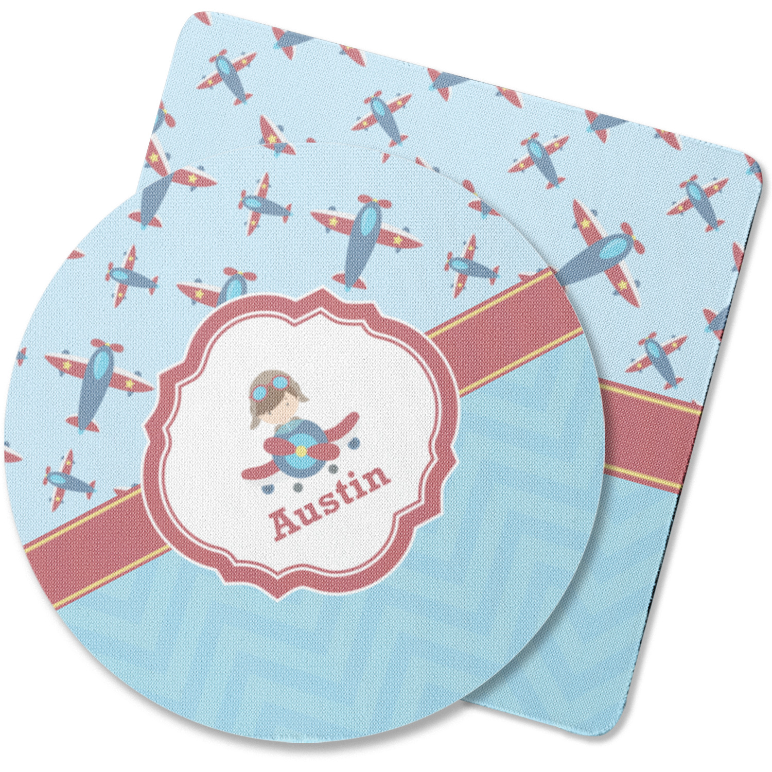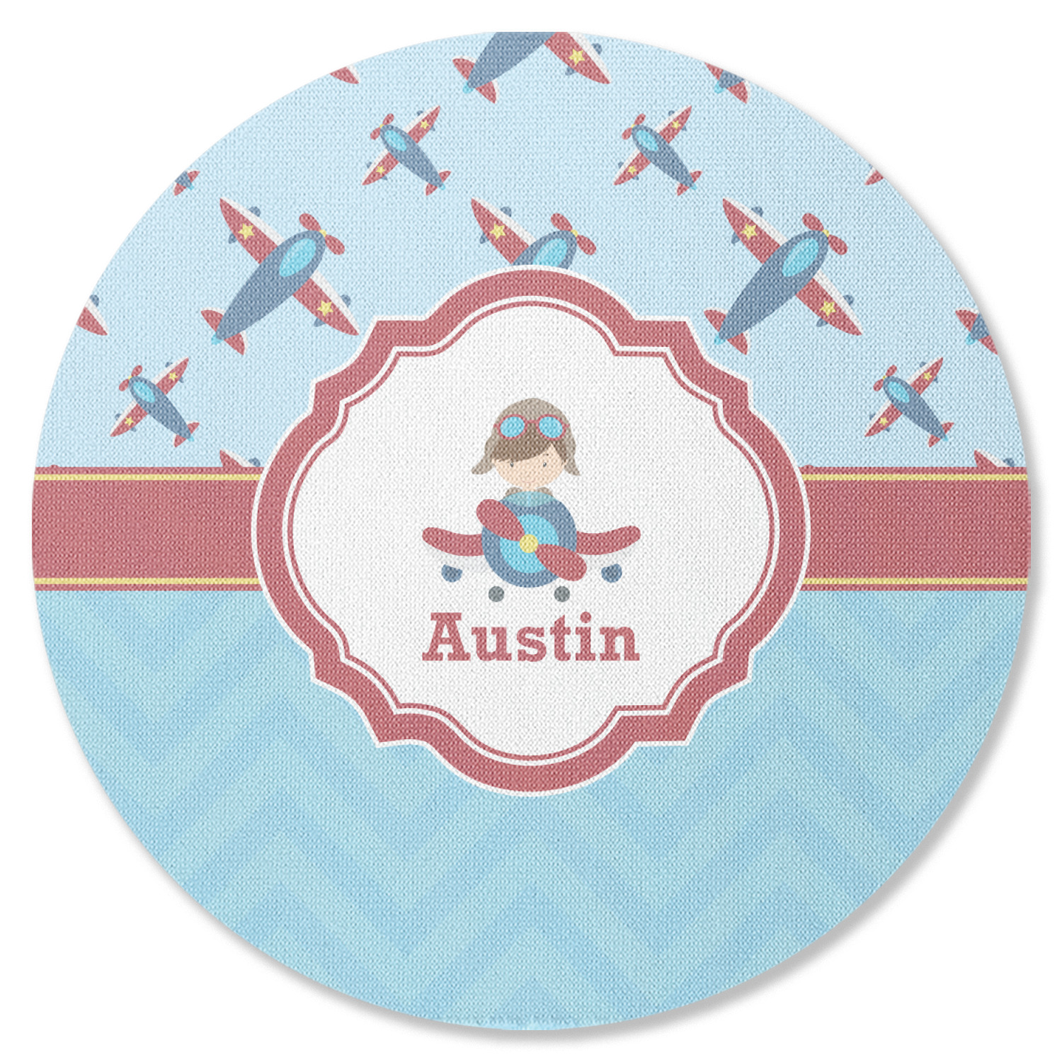 This Airplane themed design features a little pilot in his own plane with his name just below it within a red and yellow frame. The design also features planes in the sky above and blue chevron stripes below with a red stripe to tie it all together.