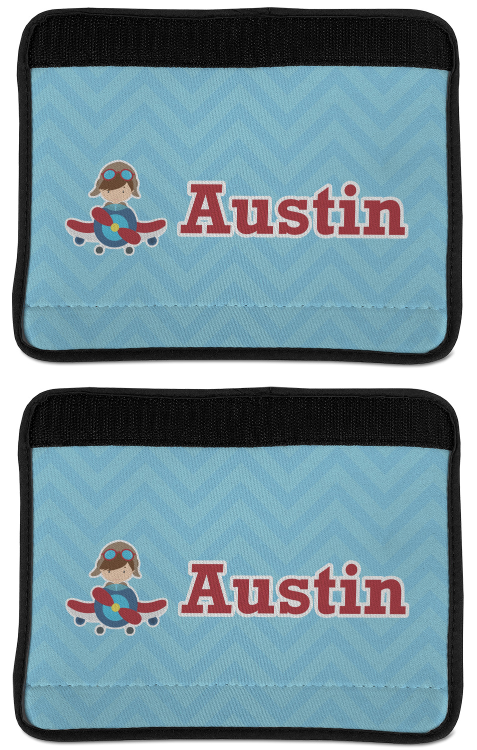 Made from neoprene, our seat belt strap covers wrap around the belt itself and have a Velcro tab for easy attachment and closure. The belt's edges are trimmed with a black polyester for a secure finish. Each cover is 9.5 by 7 inches when open and 9.5 by 2.5 inches when closed. We print your personalized design on the face of the seat belt pad.