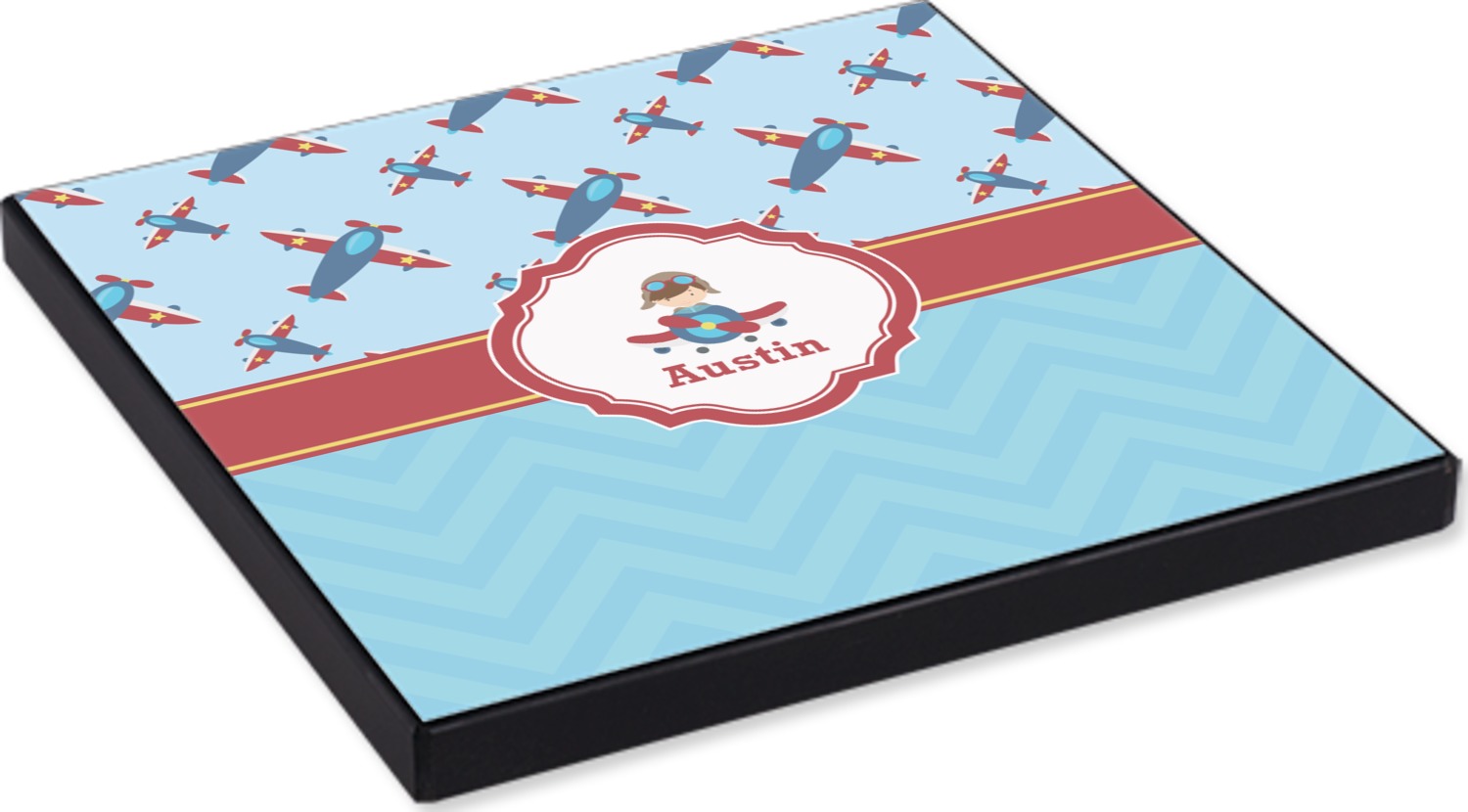 This Airplane themed design features a little pilot in his own plane with his name just below it within a red and yellow frame. The design also features planes in the sky above and blue chevron stripes below with a red stripe to tie it all together.
