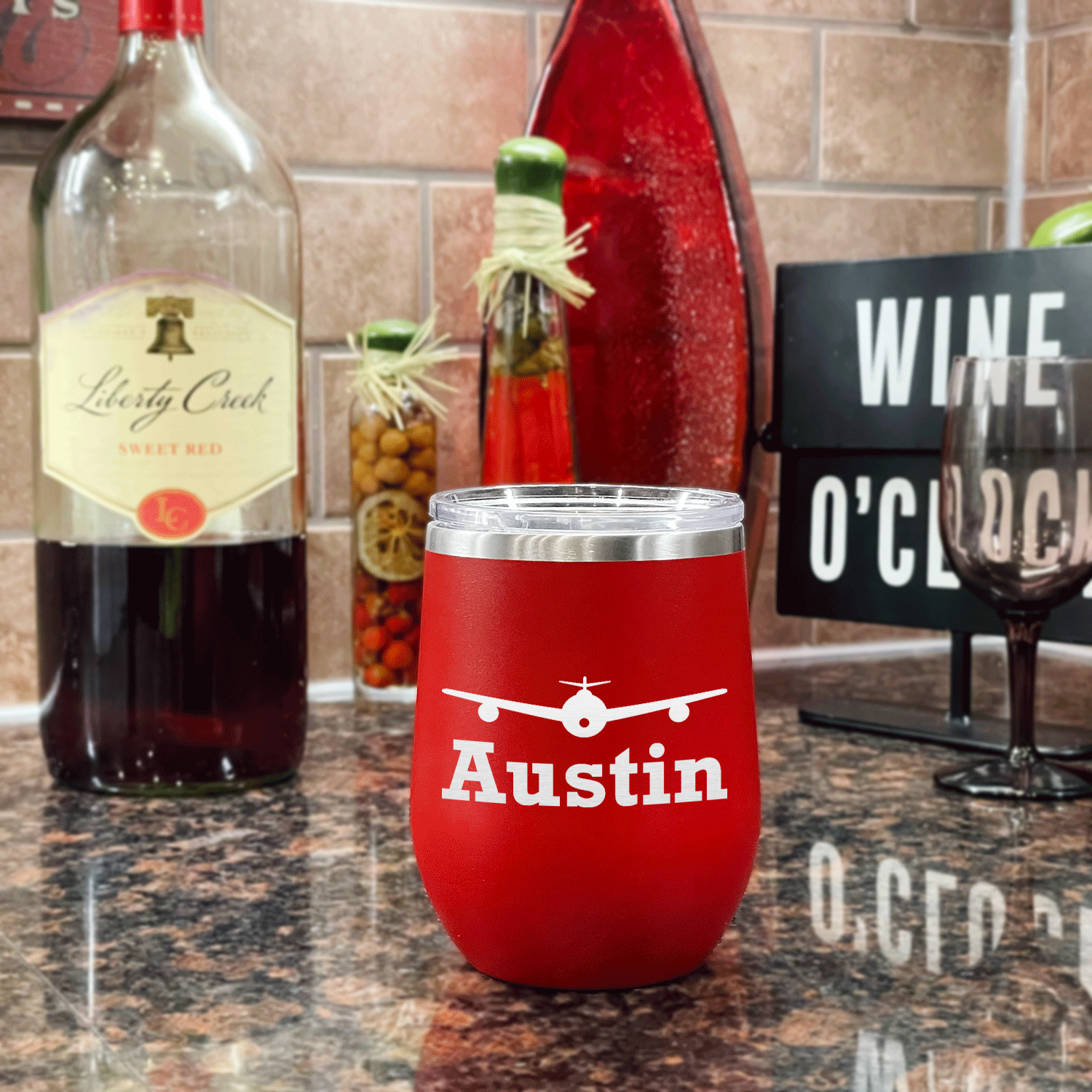Design your wine tumbler with a cool graphic or quote. Even put your initials or monogram! These cups are laser engraved, which looks extra sharp on the metal tumbler.