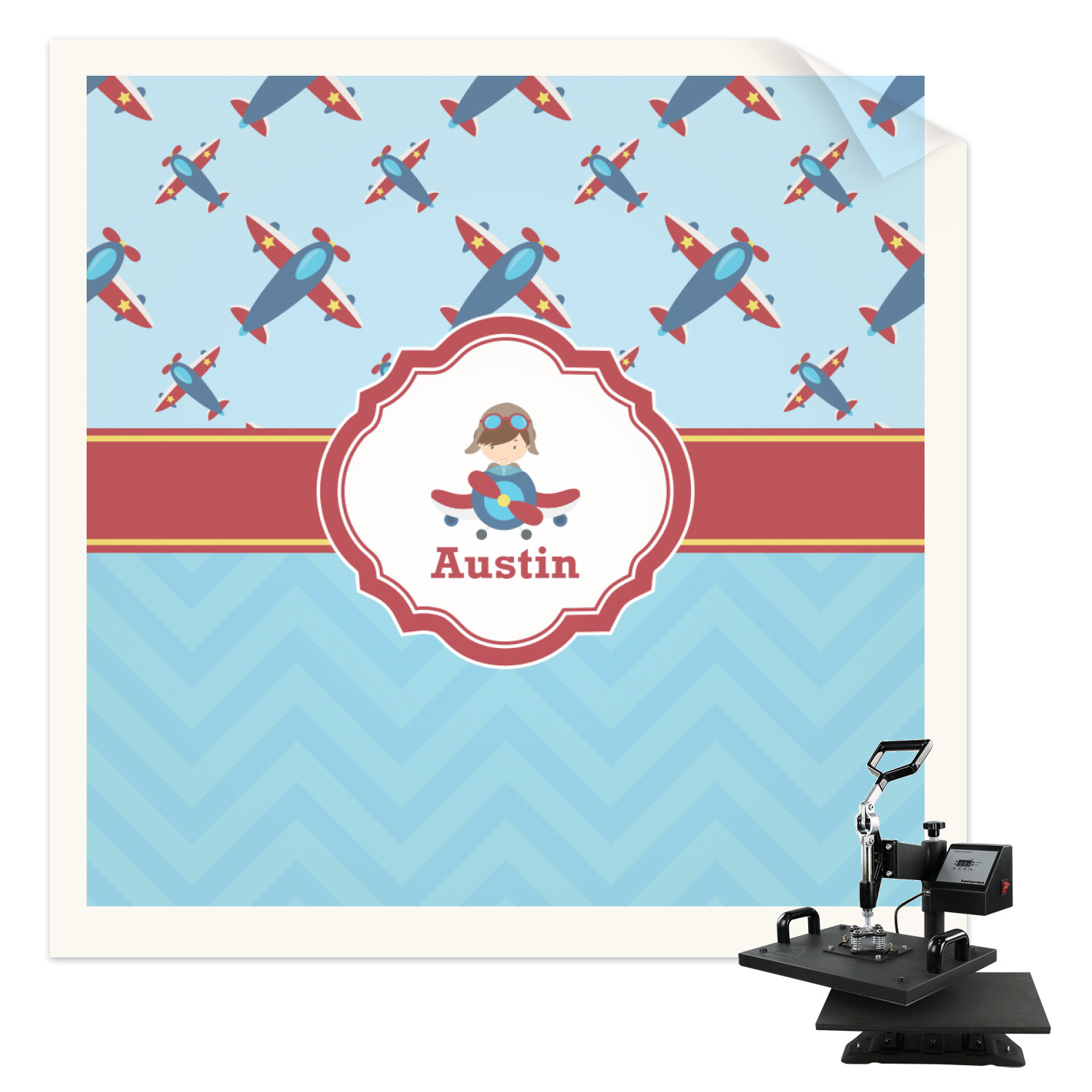 This Airplane themed design features a little pilot in his own plane with his name just below it within a red and yellow frame. The design also features planes in the sky above and blue chevron stripes below with a red stripe to tie it all together.