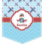 This Airplane themed design features a little pilot in his own plane with his name just below it within a red and yellow frame. The design also features planes in the sky above and blue chevron stripes below with a red stripe to tie it all together.