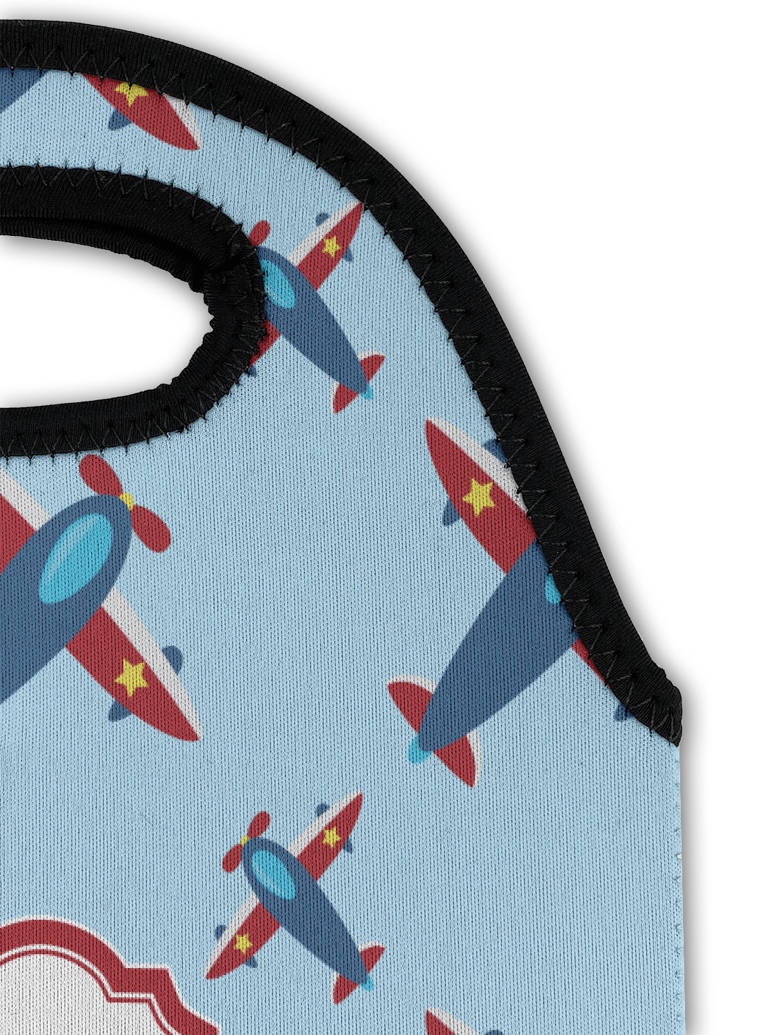 This Airplane themed design features a little pilot in his own plane with his name just below it within a red and yellow frame. The design also features planes in the sky above and blue chevron stripes below with a red stripe to tie it all together.