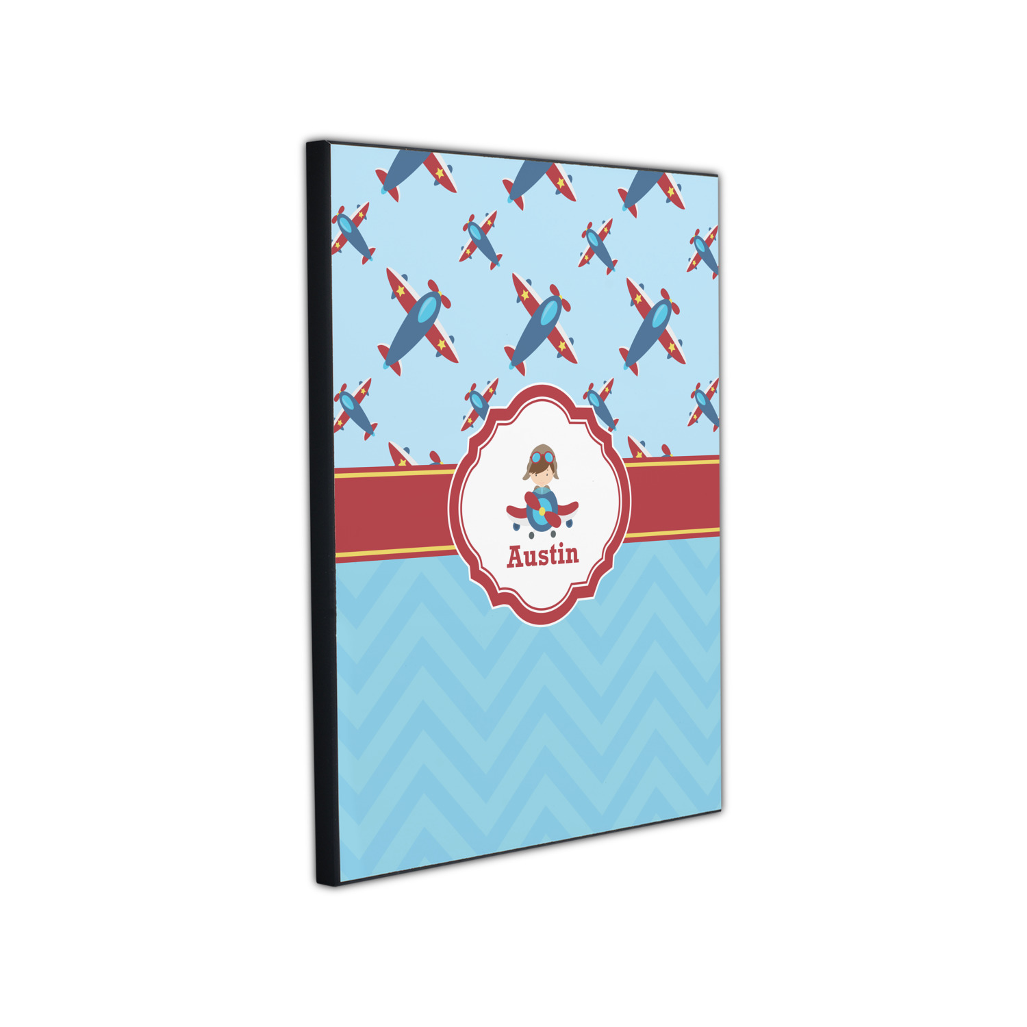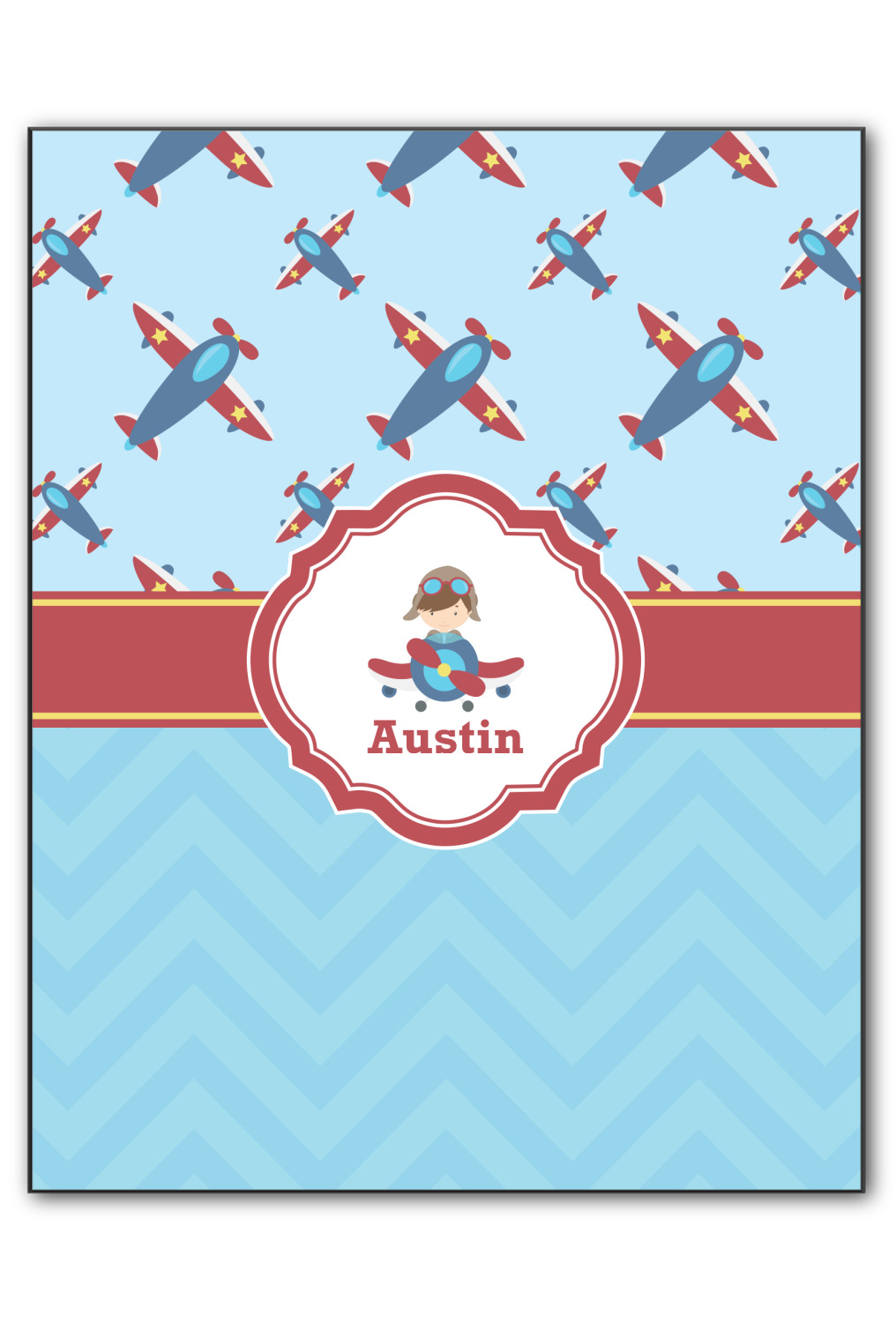 This Airplane themed design features a little pilot in his own plane with his name just below it within a red and yellow frame. The design also features planes in the sky above and blue chevron stripes below with a red stripe to tie it all together.