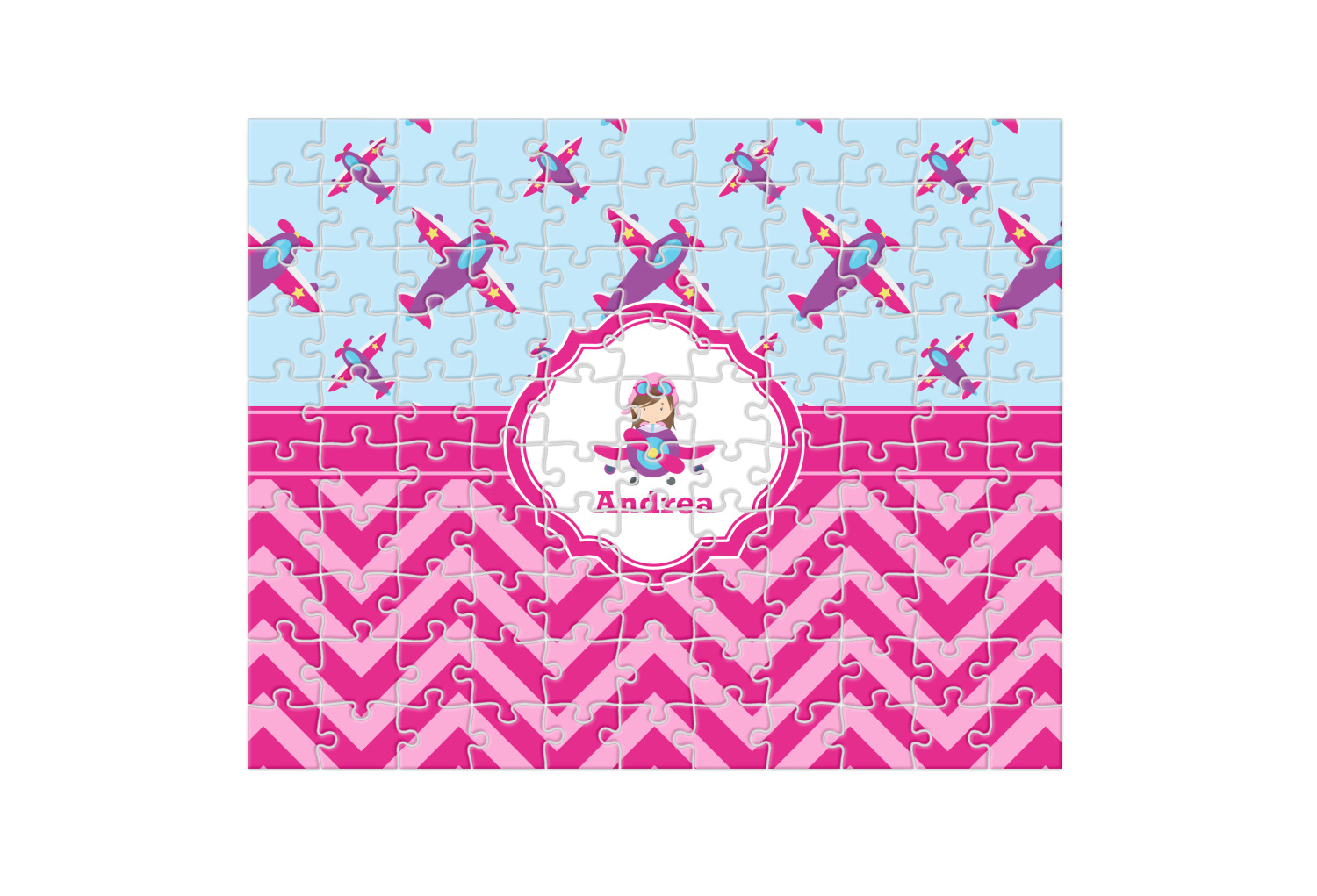 This Airplane themed design for girls features a little pilot in her own plane with her name just below it within a hot pink frame. The design also features planes in the sky above and pink chevron stripes below with a hot pink band to tie it all together.