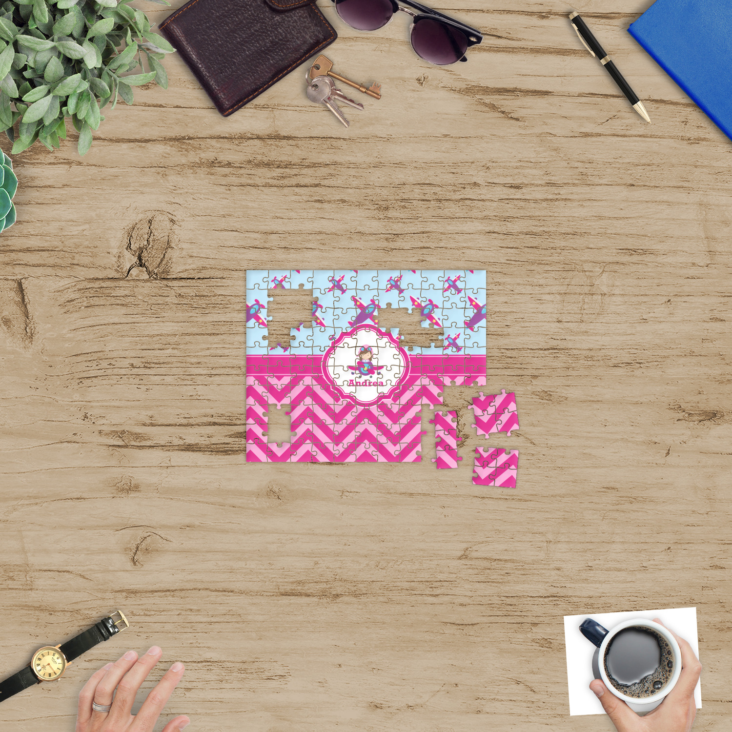 You can also upload your logo or art that you or your kids drew. To create more challenging jigsaw puzzles, you can create a pattern from with your logo or artwork. You can also add other elements such as text or personalization.