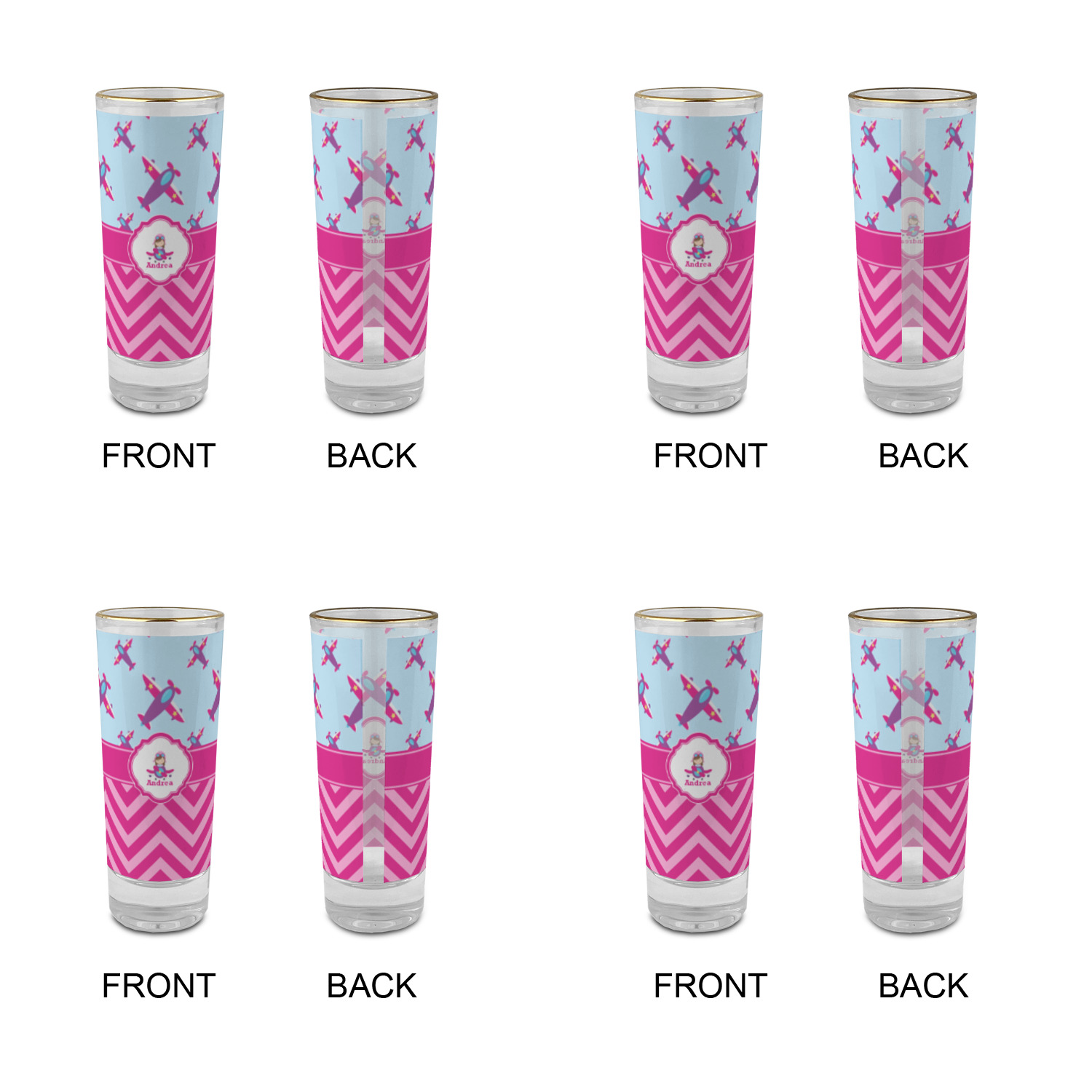 These glass shooter glasses are printed in full color with the design of your choice. These are a tall shooter 2 oz size and stand 4" tall. The print is a full wrap design to boldly display your personalization.
