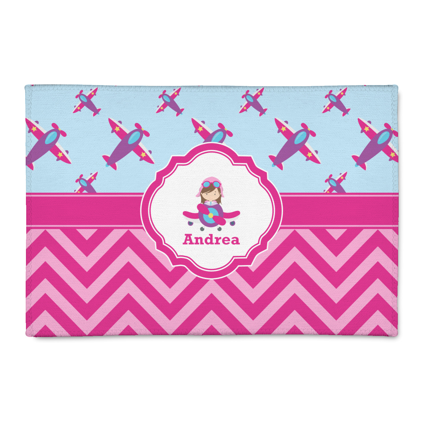 This Airplane themed design for girls features a little pilot in her own plane with her name just below it within a hot pink frame. The design also features planes in the sky above and pink chevron stripes below with a hot pink band to tie it all together.