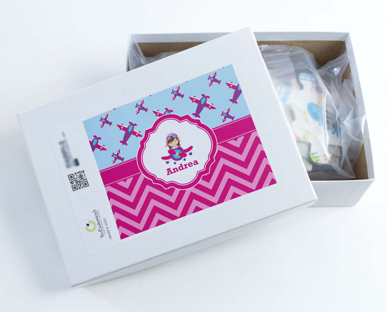 This Airplane themed design for girls features a little pilot in her own plane with her name just below it within a hot pink frame. The design also features planes in the sky above and pink chevron stripes below with a hot pink band to tie it all together.