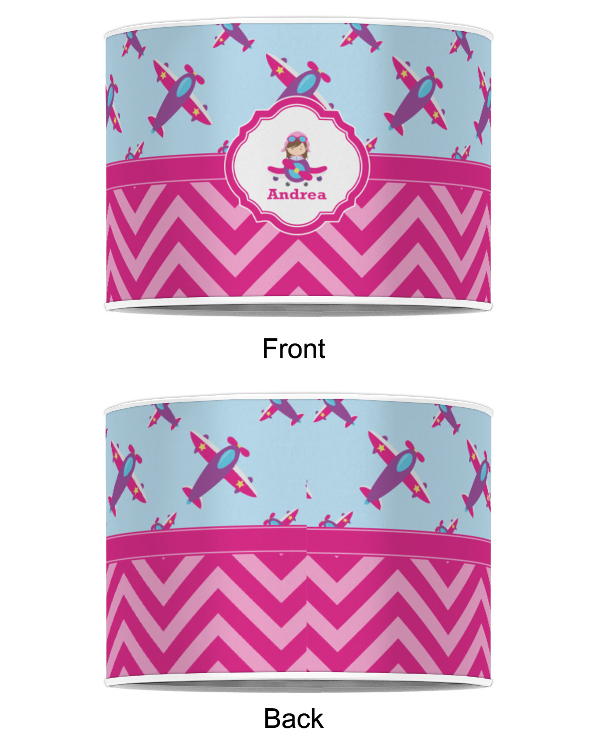 This Airplane themed design for girls features a little pilot in her own plane with her name just below it within a hot pink frame. The design also features planes in the sky above and pink chevron stripes below with a hot pink band to tie it all together.
