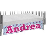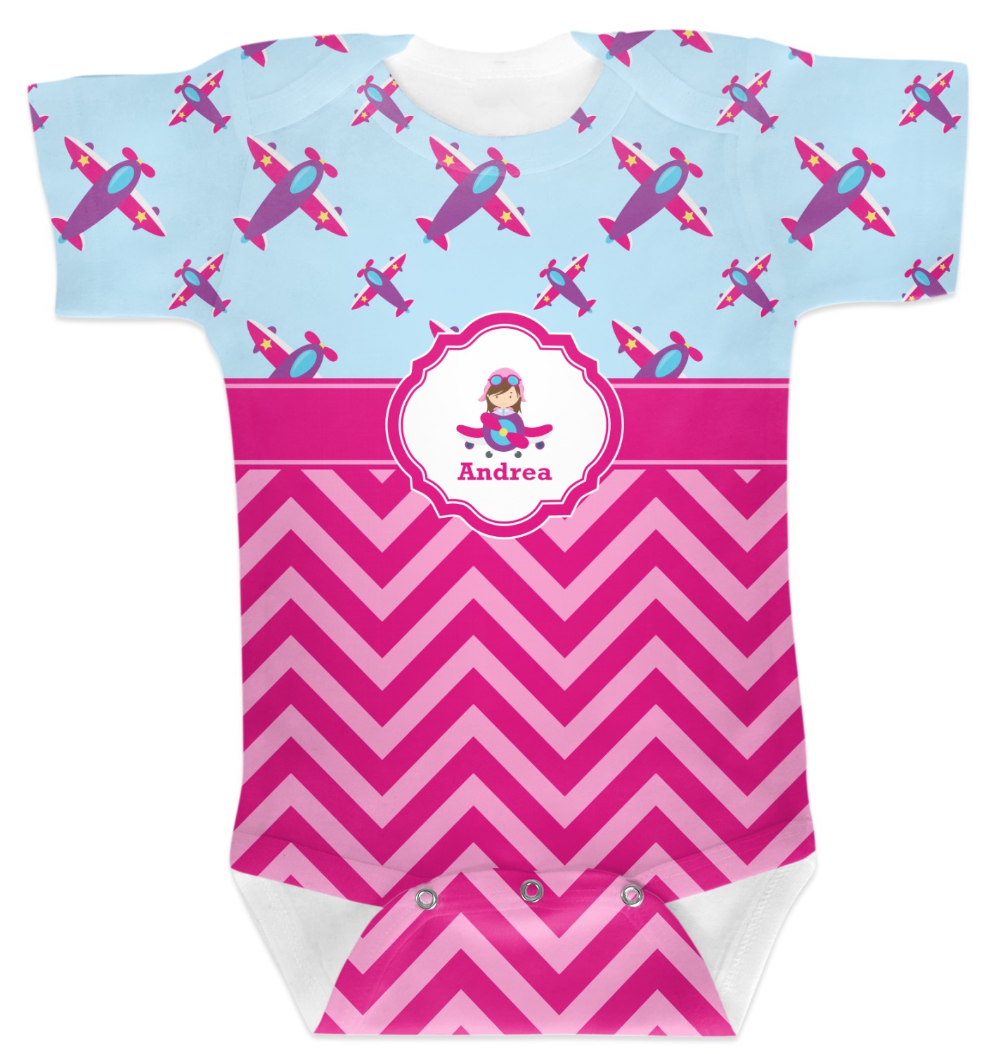 This Airplane themed design for girls features a little pilot in her own plane with her name just below it within a hot pink frame. The design also features planes in the sky above and pink chevron stripes below with a hot pink band to tie it all together.