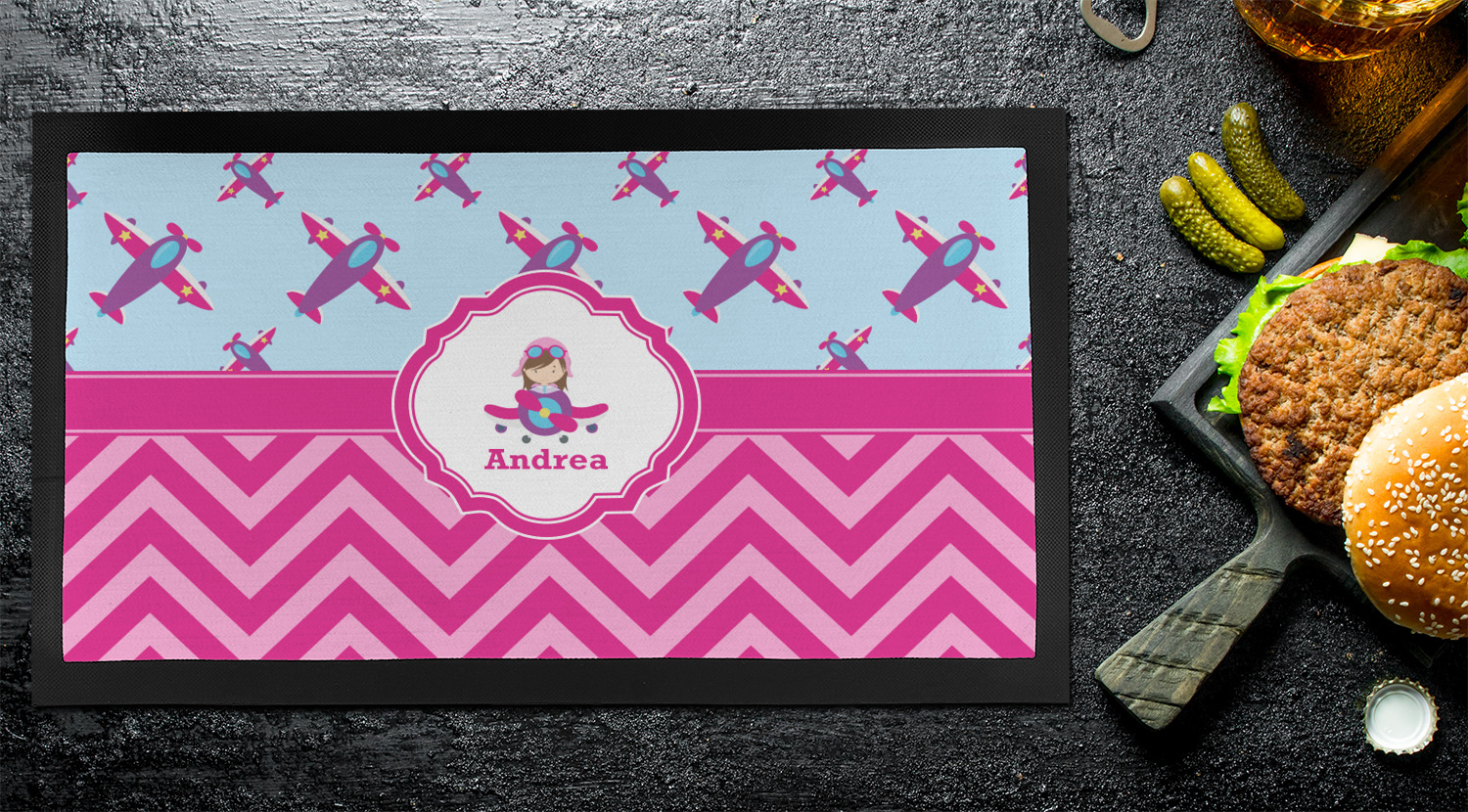This Airplane themed design for girls features a little pilot in her own plane with her name just below it within a hot pink frame. The design also features planes in the sky above and pink chevron stripes below with a hot pink band to tie it all together.
