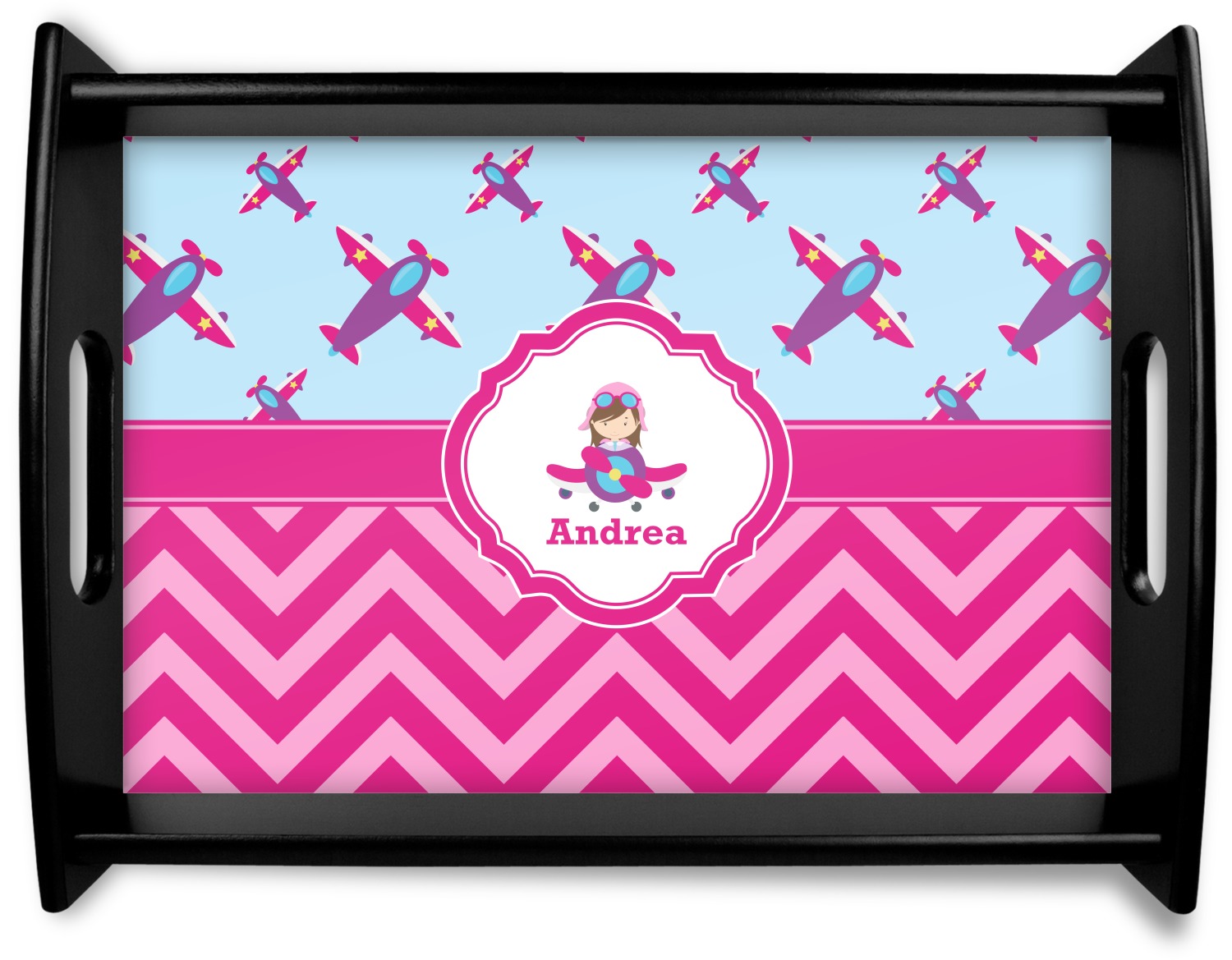This Airplane themed design for girls features a little pilot in her own plane with her name just below it within a hot pink frame. The design also features planes in the sky above and pink chevron stripes below with a hot pink band to tie it all together.