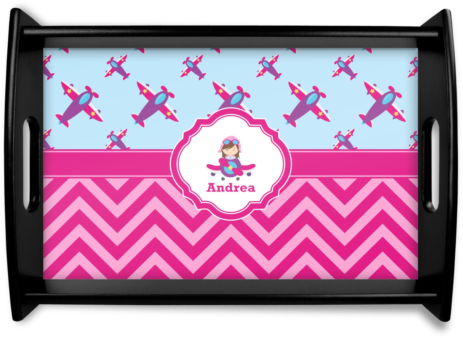 This Airplane themed design for girls features a little pilot in her own plane with her name just below it within a hot pink frame. The design also features planes in the sky above and pink chevron stripes below with a hot pink band to tie it all together.