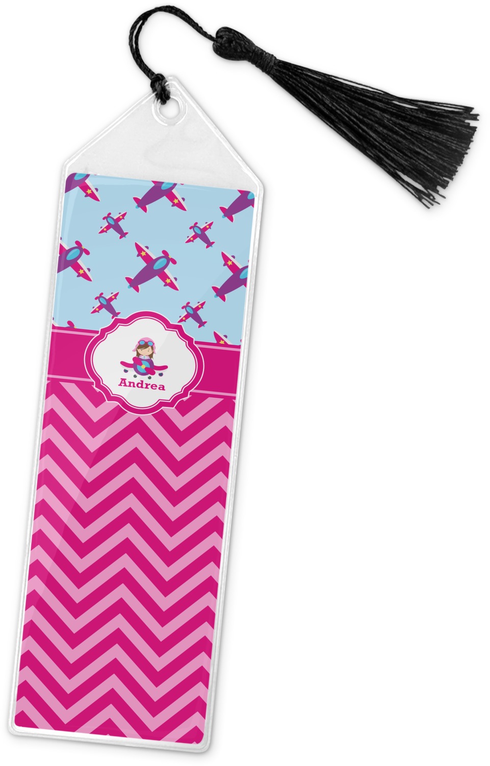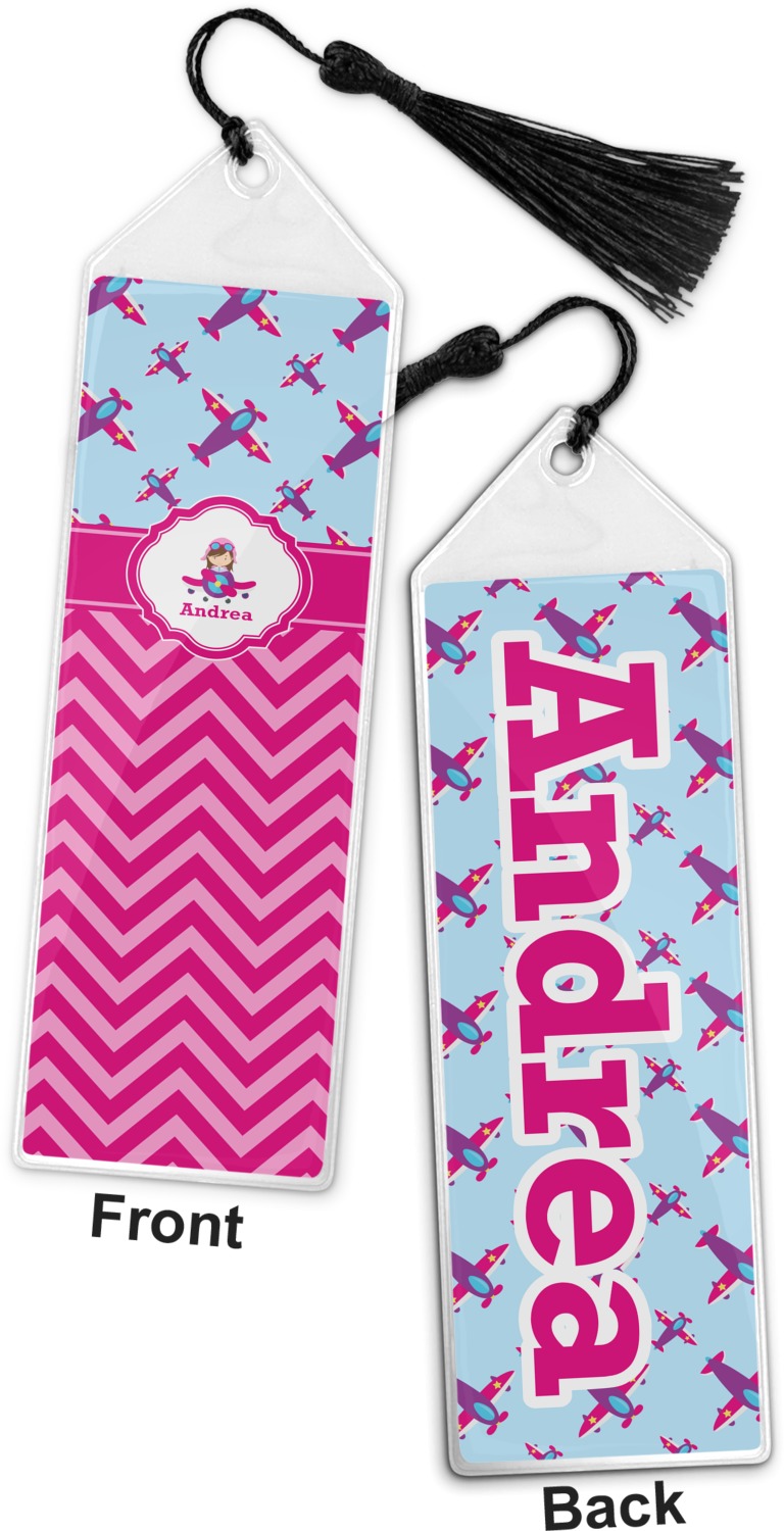 Your personalized bookmark is made of a sturdy, clear vinyl, and is approximately 7.5" x 2.25". We display your personalization on vinyl inserts that are placed on both sides. Accompanying each book marker is a black, fringe tassel that attaches to the reinforced, triangular header.