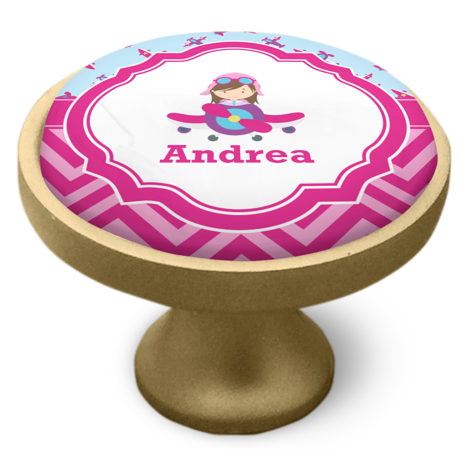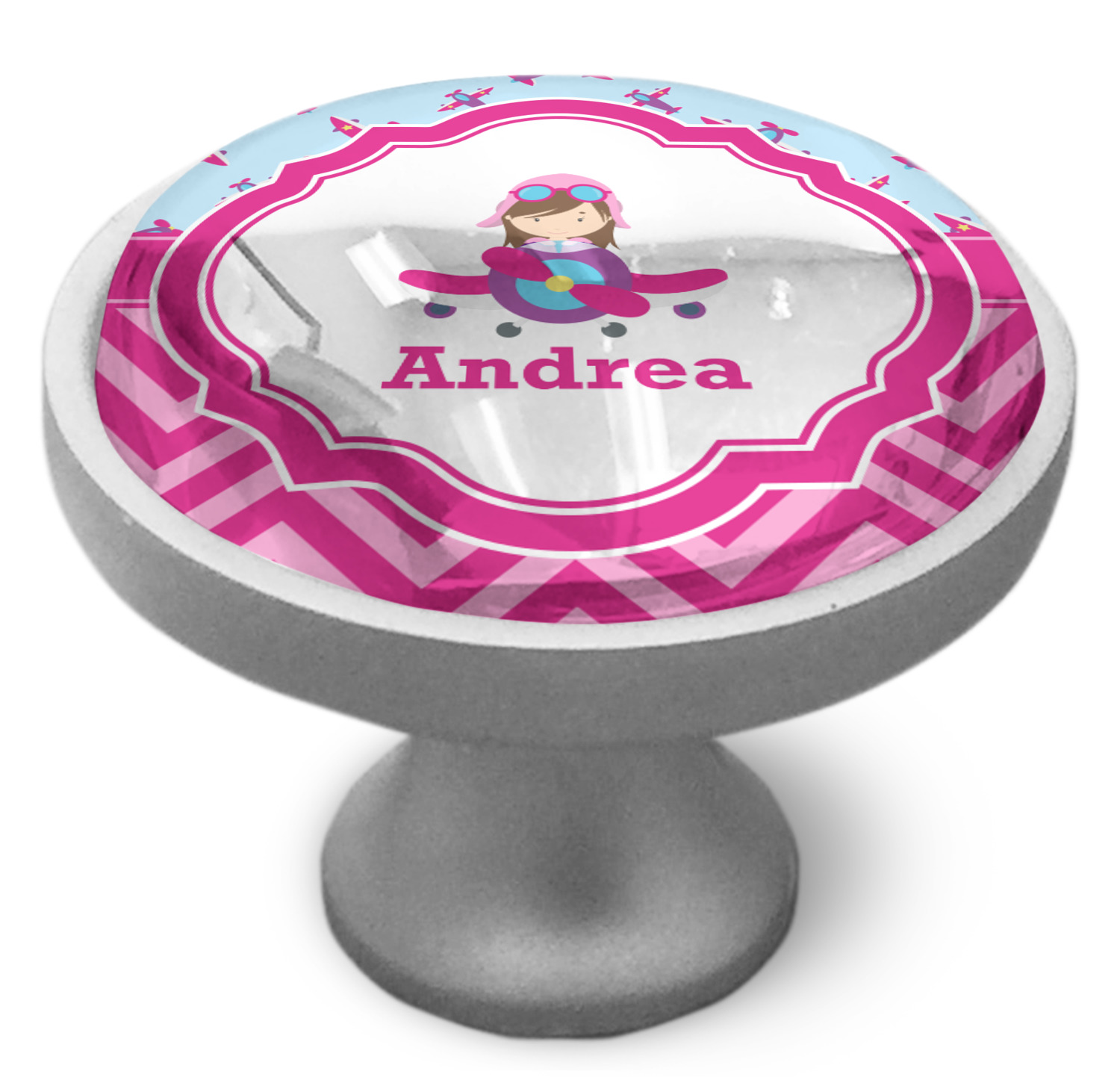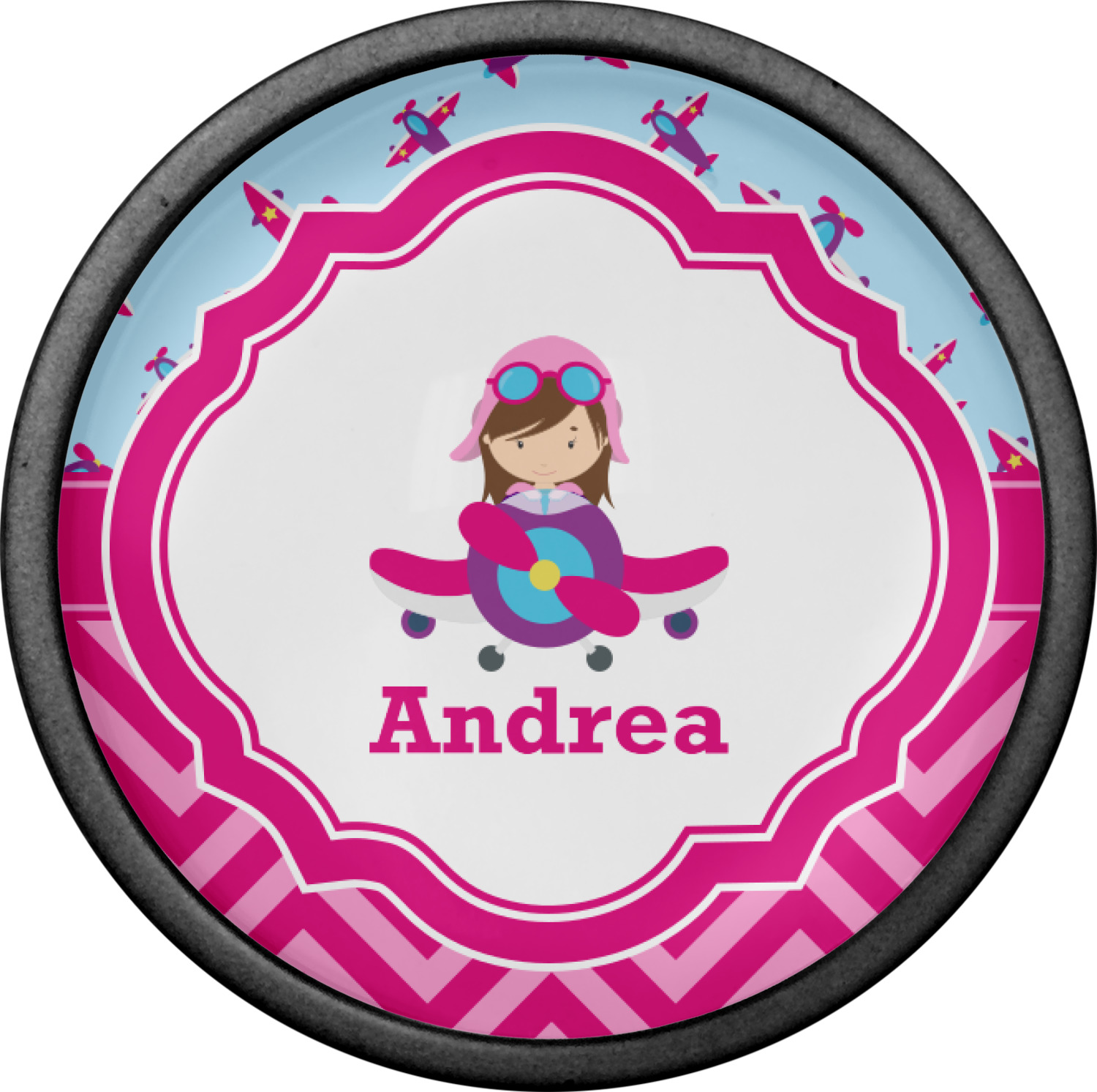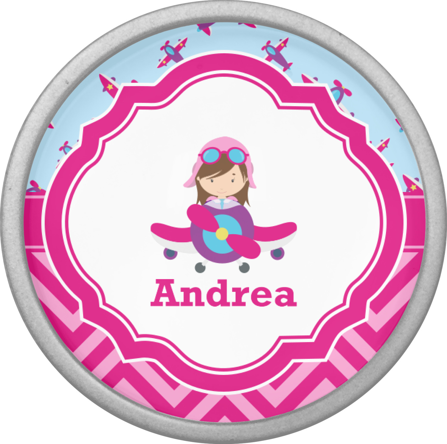 This Airplane themed design for girls features a little pilot in her own plane with her name just below it within a hot pink frame. The design also features planes in the sky above and pink chevron stripes below with a hot pink band to tie it all together.