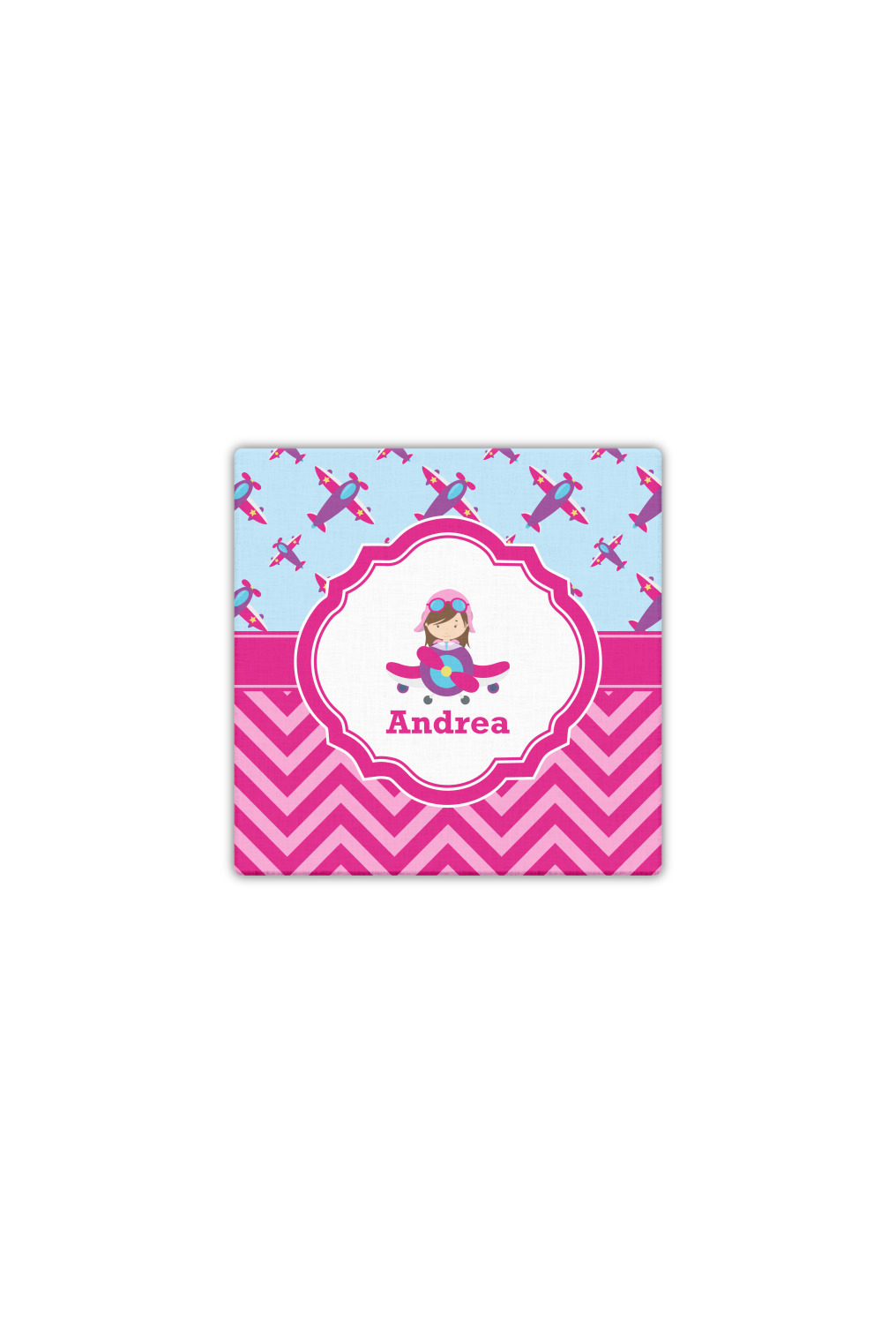 This Airplane themed design for girls features a little pilot in her own plane with her name just below it within a hot pink frame. The design also features planes in the sky above and pink chevron stripes below with a hot pink band to tie it all together.