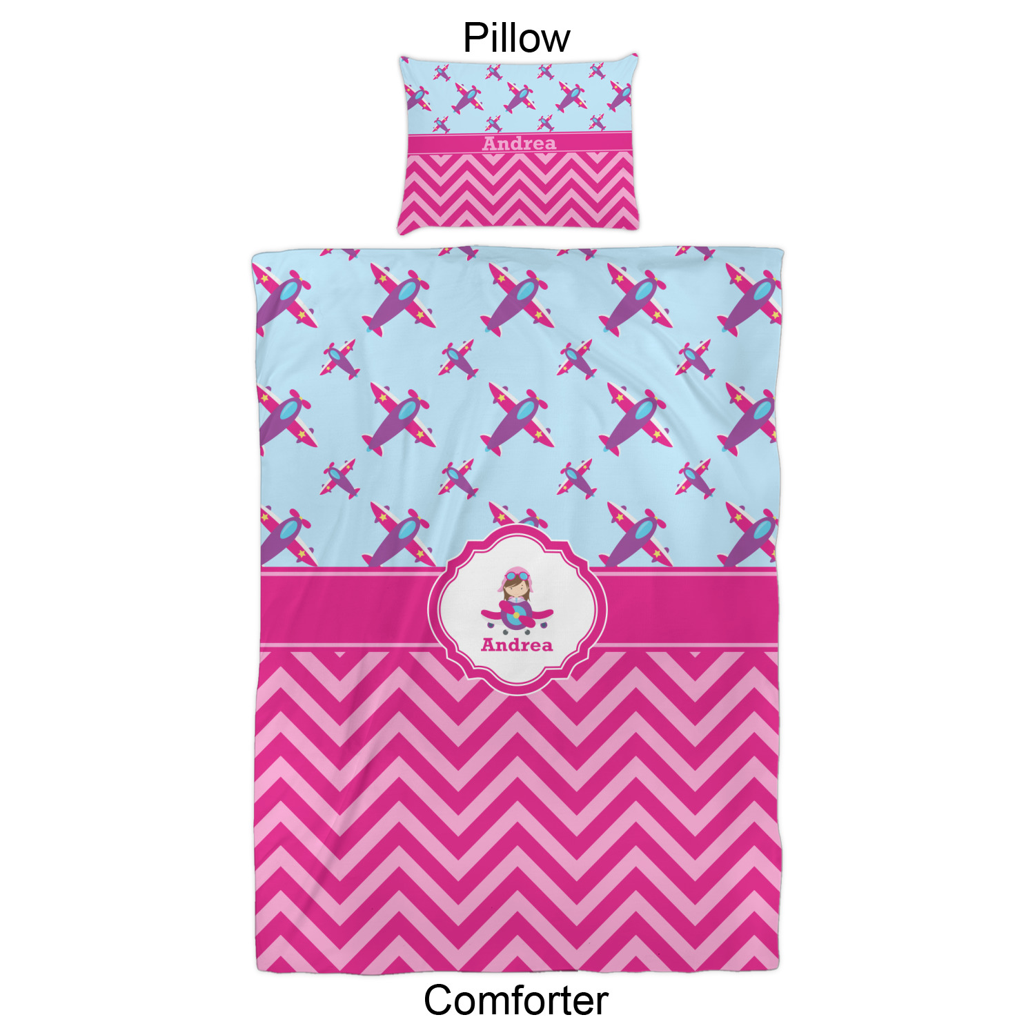 This Airplane themed design for girls features a little pilot in her own plane with her name just below it within a hot pink frame. The design also features planes in the sky above and pink chevron stripes below with a hot pink band to tie it all together.