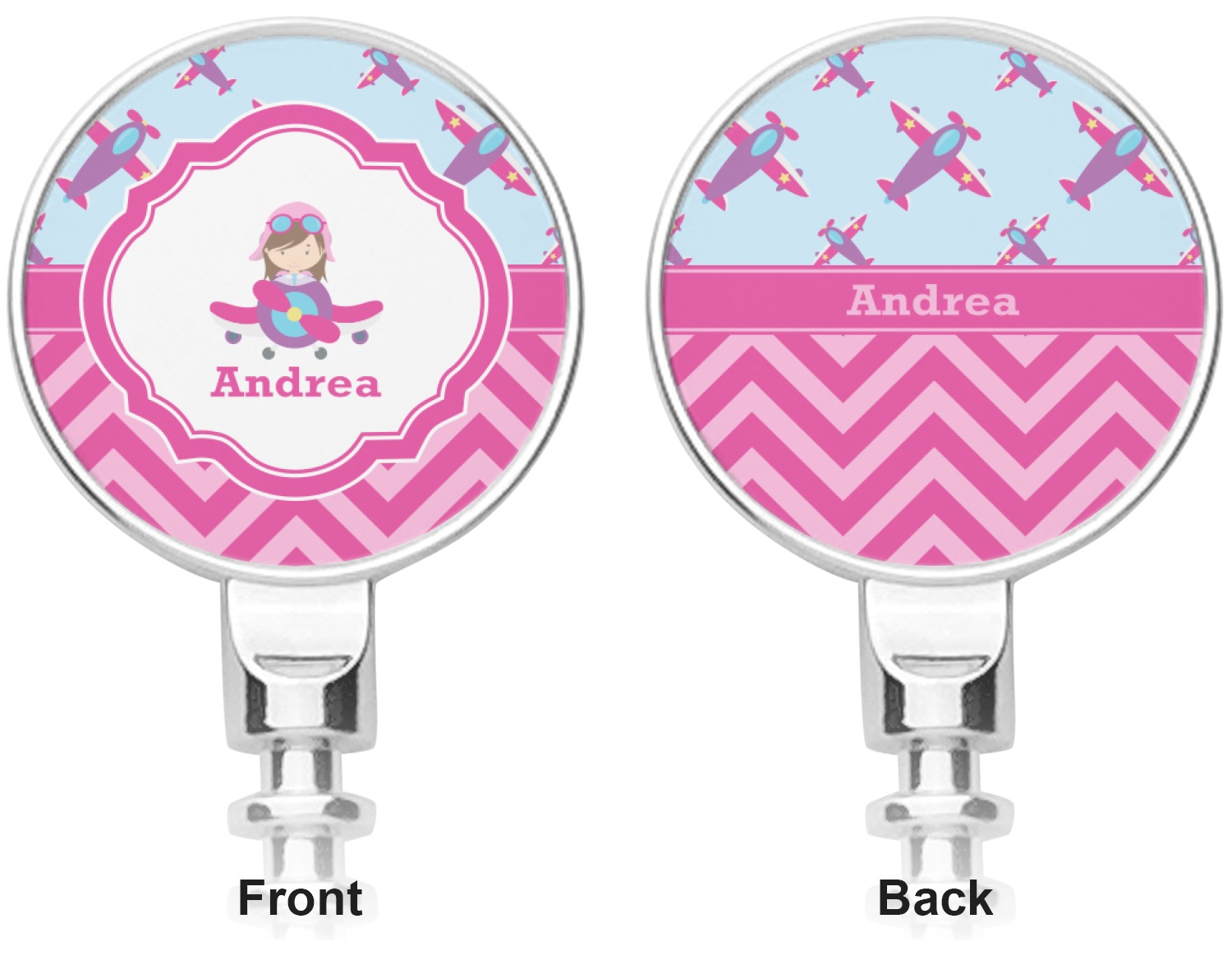 This Airplane themed design for girls features a little pilot in her own plane with her name just below it within a hot pink frame. The design also features planes in the sky above and pink chevron stripes below with a hot pink band to tie it all together.