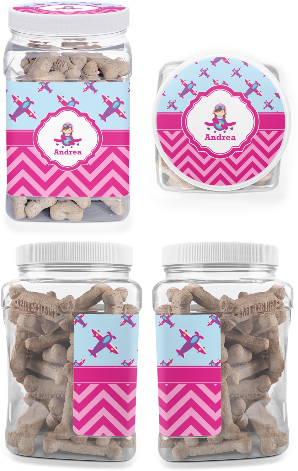 This half gallon jar, made from a sturdy plastic, is the perfect way to keep treats from any naughty pet paws, while still keeping them ready on hand for when your pup performs an impressive trick. This dog cookie jar features a screw-on, white lid that displays your personalized design on a vinyl sticker. We apply another customized sticker that wraps around the front and sides of the jar. Our dog treat jar also has indentations on the rear ends of the sides, which allows for convenient handling, and its square frame allows for easy storage.
