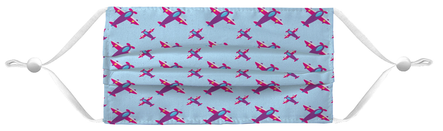 These fun face masks are 7" wide and 3.5" high. They feature pleats, adjustable ear loops, and are made with two layers of fabric. The top layer where your design is printed is a breathable polyester sheeting, while the inside layer is a soft microfiber polyester