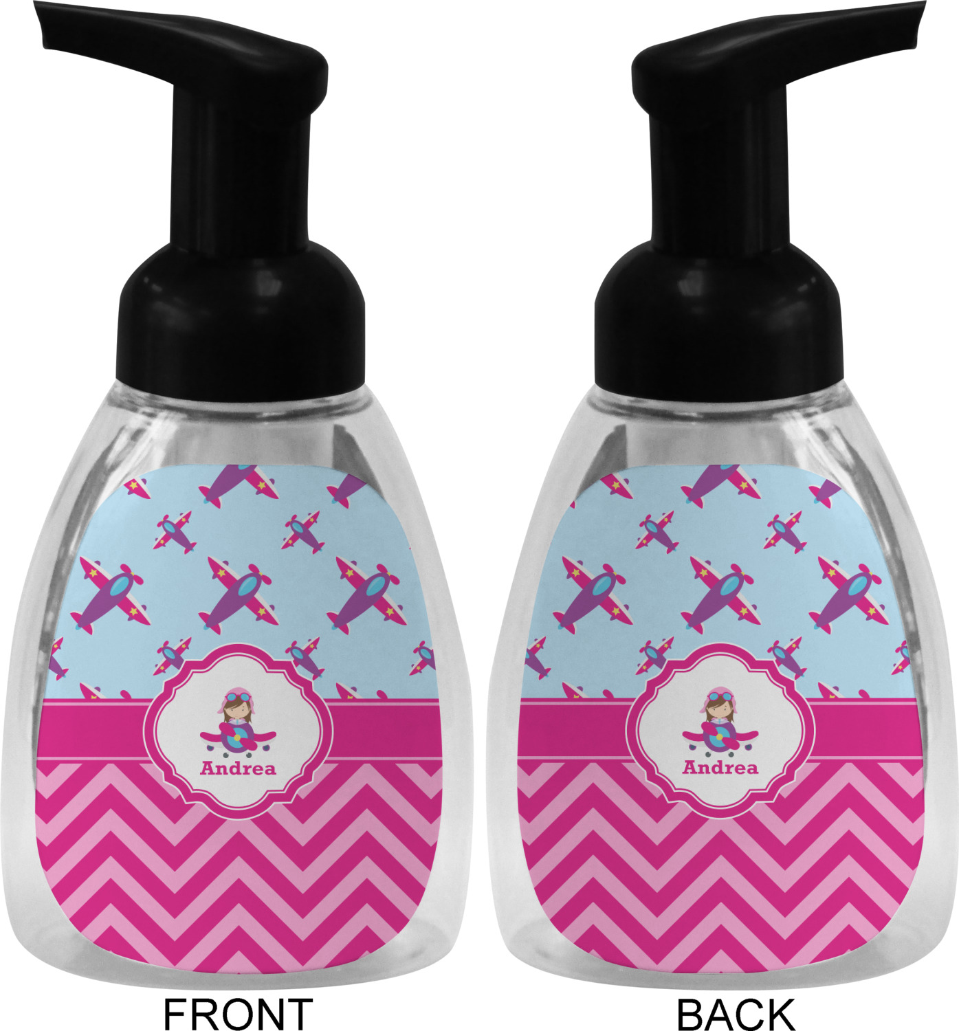 This soap dispenser is made of a robust plastic and has a clear base. The included soap pump is available in black or white color. This dispenser is 6.5 inches tall, 3 inches wide, and 2 inches deep. We display your customized designs on the front and back sides of these foaming hand soap dispensers.