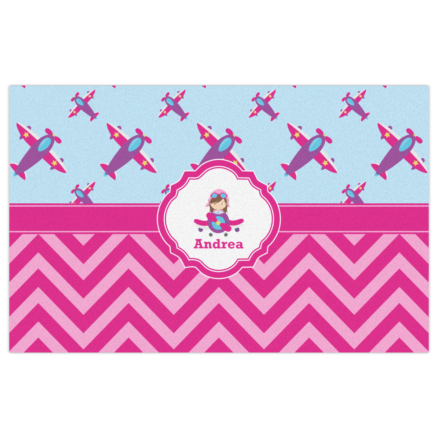 This Airplane themed design for girls features a little pilot in her own plane with her name just below it within a hot pink frame. The design also features planes in the sky above and pink chevron stripes below with a hot pink band to tie it all together.