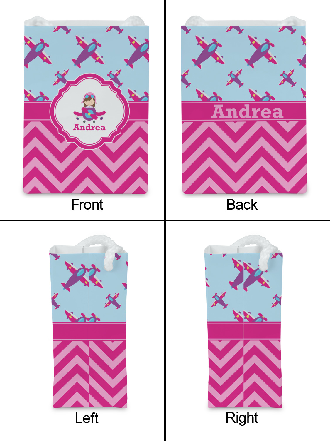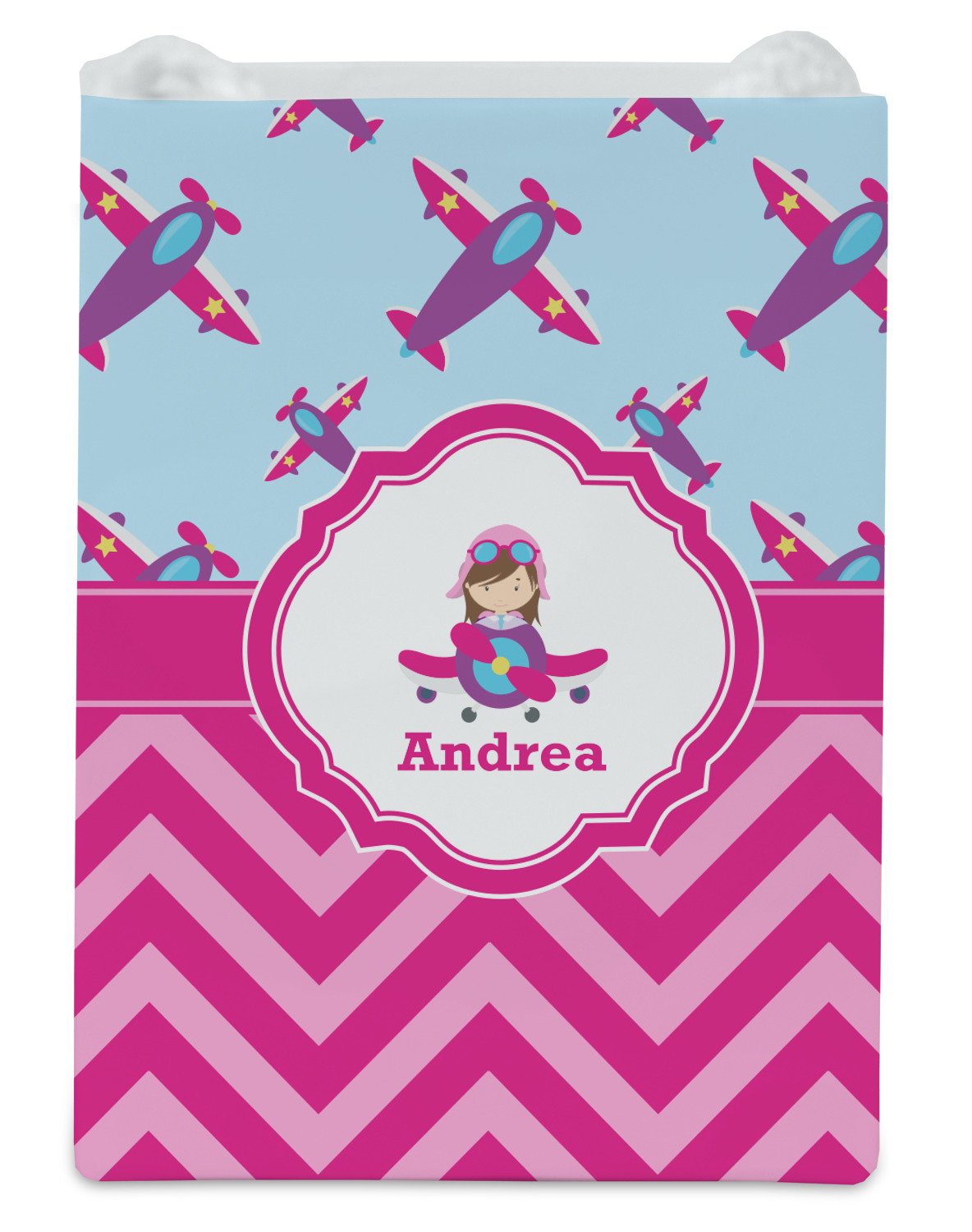 This Airplane themed design for girls features a little pilot in her own plane with her name just below it within a hot pink frame. The design also features planes in the sky above and pink chevron stripes below with a hot pink band to tie it all together.