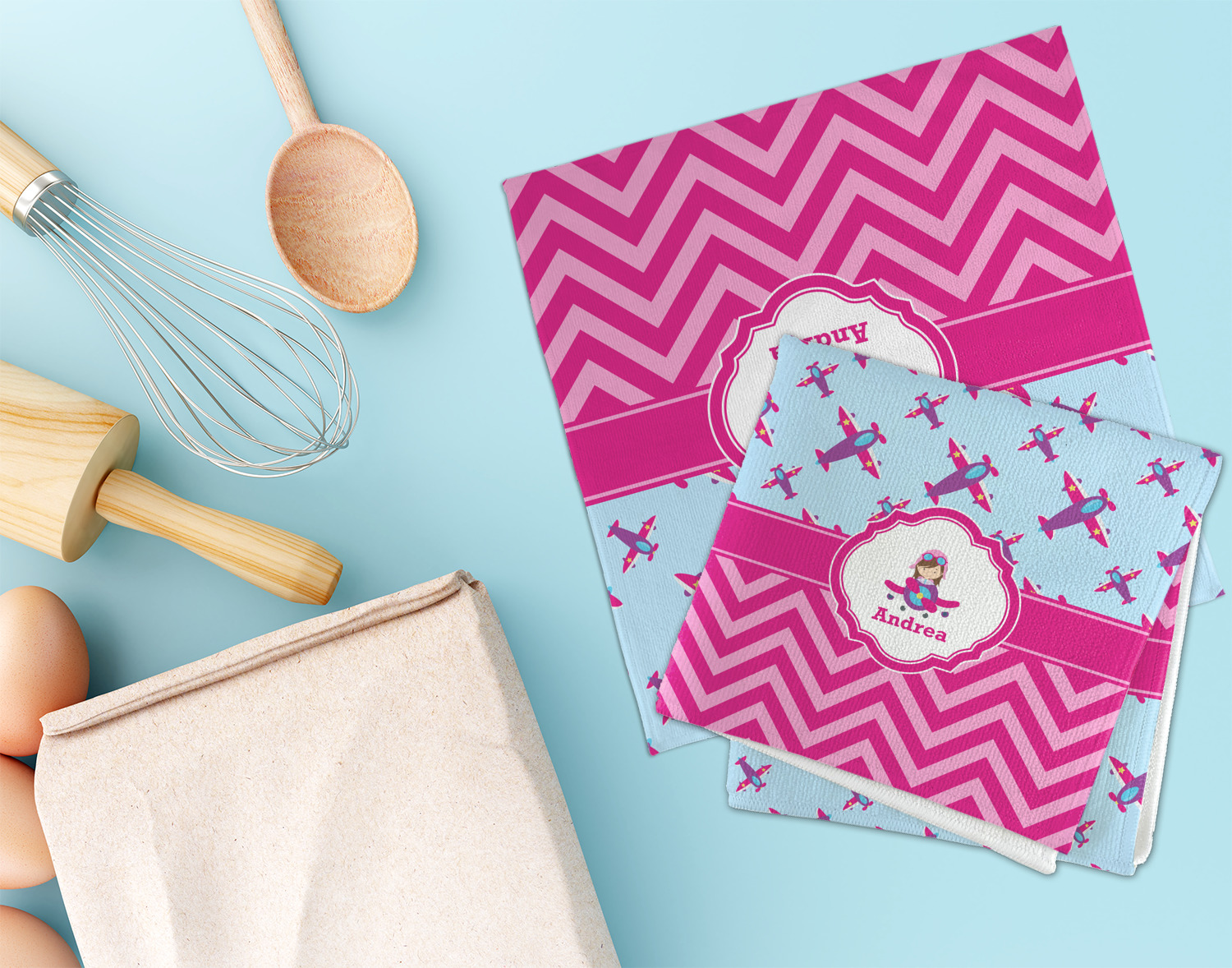 This Airplane themed design for girls features a little pilot in her own plane with her name just below it within a hot pink frame. The design also features planes in the sky above and pink chevron stripes below with a hot pink band to tie it all together.