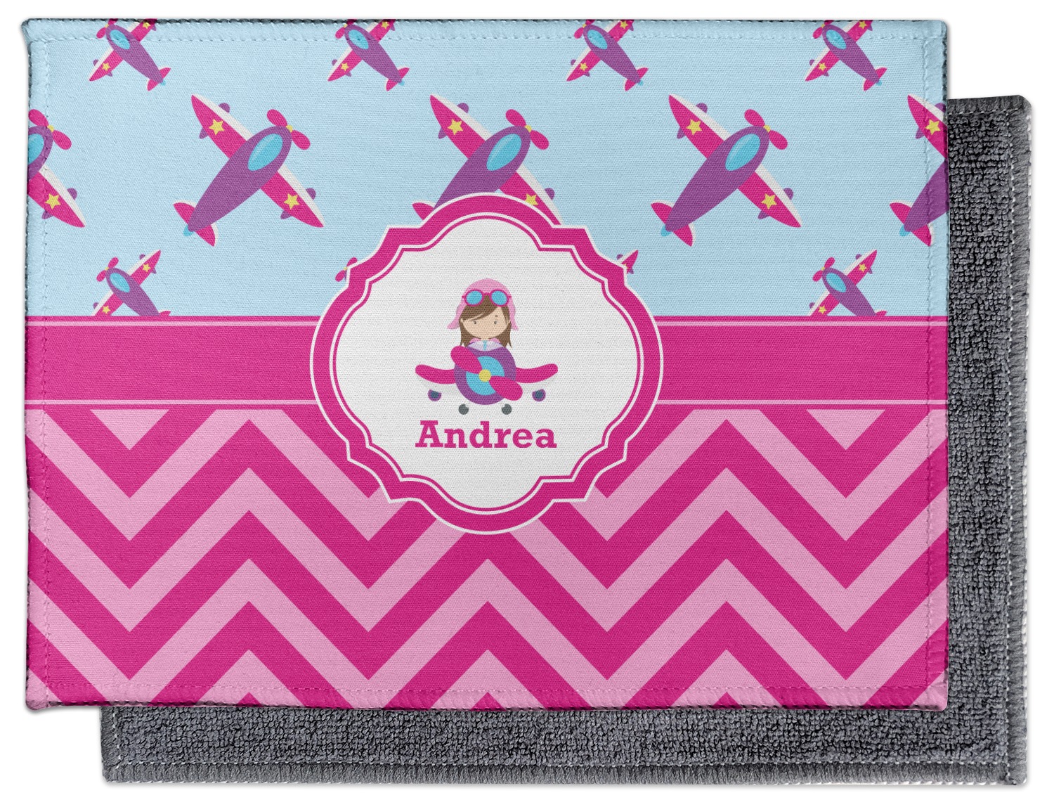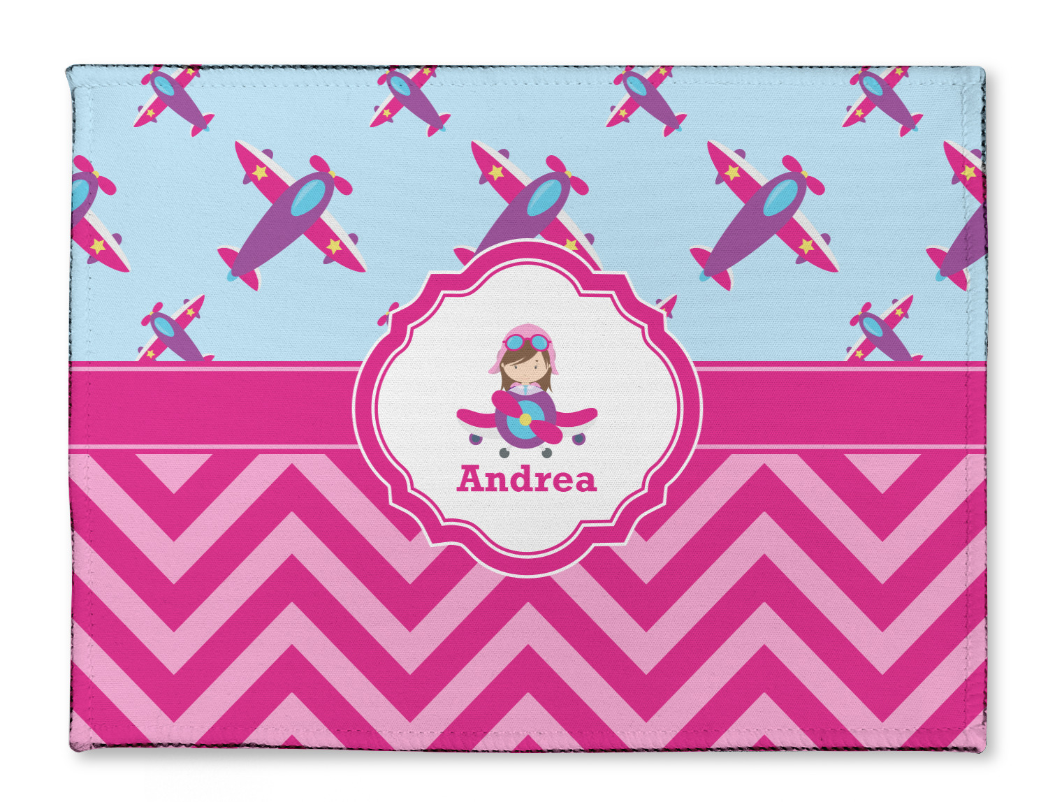 This Airplane themed design for girls features a little pilot in her own plane with her name just below it within a hot pink frame. The design also features planes in the sky above and pink chevron stripes below with a hot pink band to tie it all together.