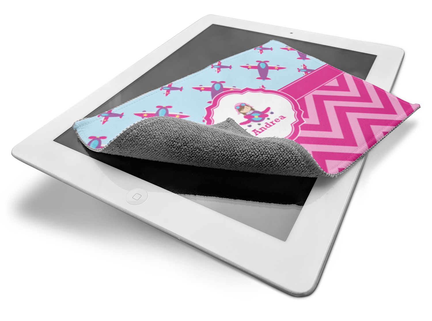 The back of this cleaning cloth is made from a gentle, grey microfiber material, that is masterful at removing smudges, grease, and fingerprints from lenses or electronic screens. The front side of the screen cleaner displays your personalized design in vibrant color. A beautiful stitch lines the edges and secures the microfiber to the polyester top. We provide you with the option of customizing this screen horizontally or vertically, depending on your preferences.