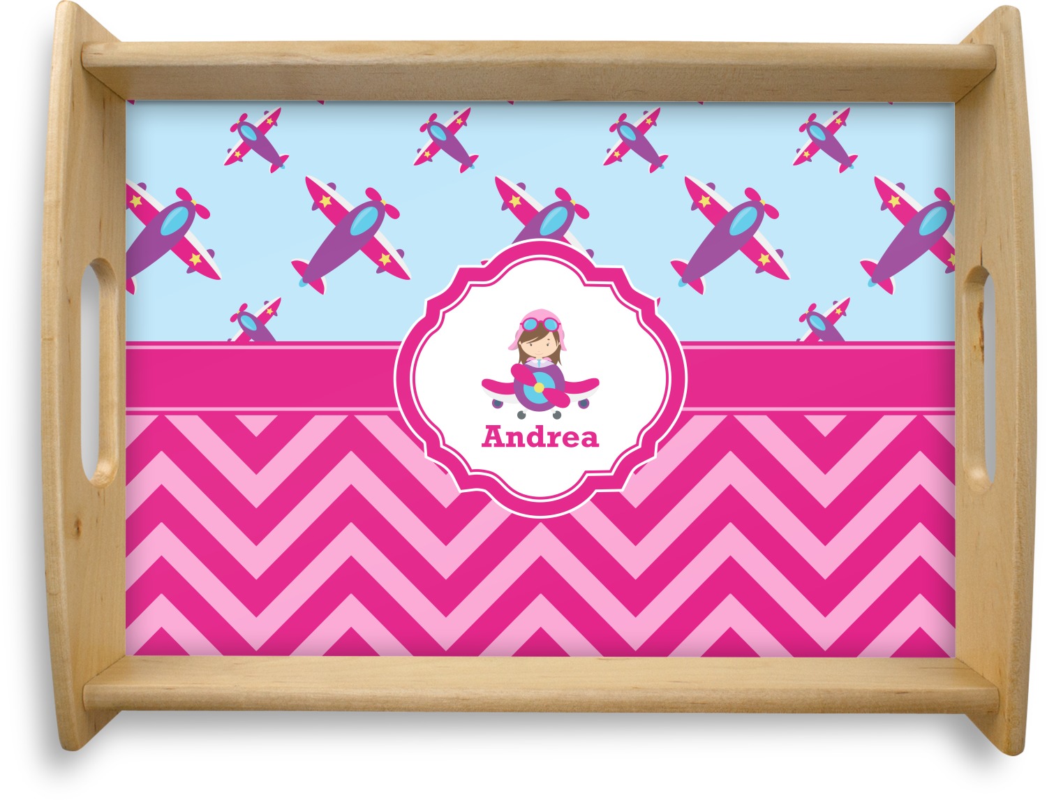 This Airplane themed design for girls features a little pilot in her own plane with her name just below it within a hot pink frame. The design also features planes in the sky above and pink chevron stripes below with a hot pink band to tie it all together.