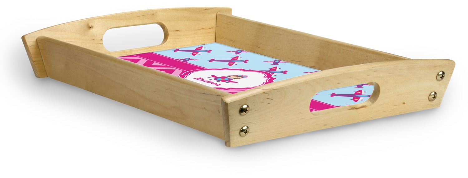 This serving tray with handles features square edges and two rounded sides, creating a very modern look. Each side is fabricated from a beautifully cut, natural wood. The bottom of the interior of the tray displays your customized design in bright, vibrant color. The tray is sold in both a black color and a natural wood look. Each variation of the wood serving tray has two sizes: Small, which is 14" x 10" x 2.25", and Large, which is 19.5" x 13.5" x 2.75".