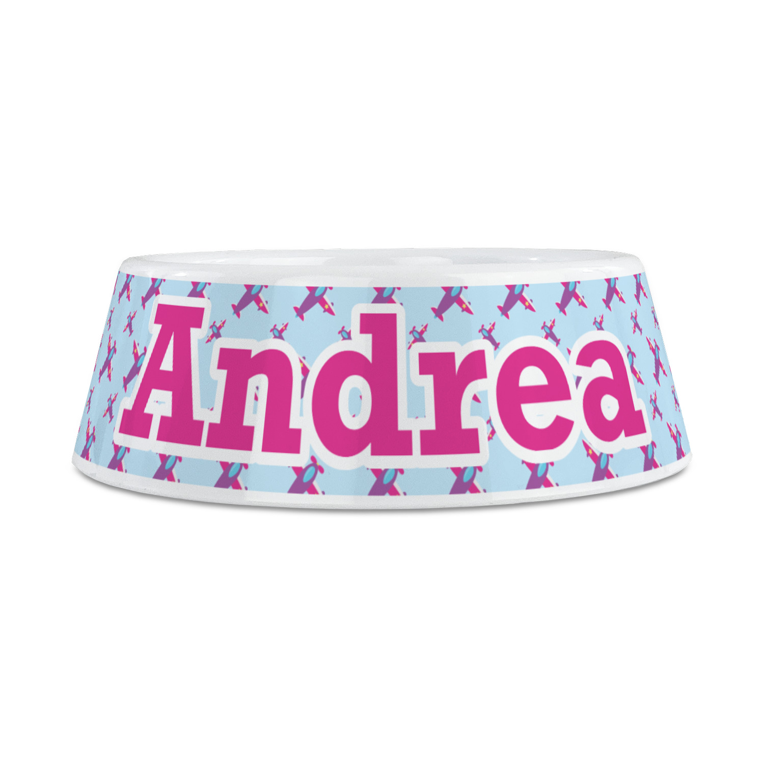 This Airplane themed design for girls features a little pilot in her own plane with her name just below it within a hot pink frame. The design also features planes in the sky above and pink chevron stripes below with a hot pink band to tie it all together.