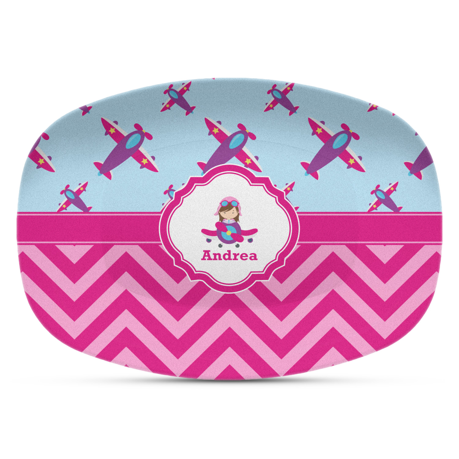 This Airplane themed design for girls features a little pilot in her own plane with her name just below it within a hot pink frame. The design also features planes in the sky above and pink chevron stripes below with a hot pink band to tie it all together.