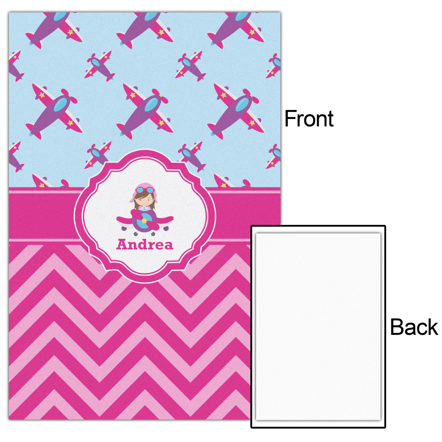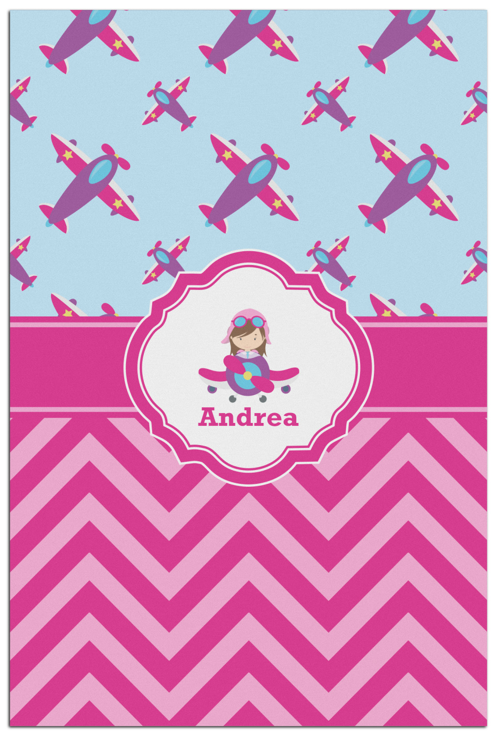 This Airplane themed design for girls features a little pilot in her own plane with her name just below it within a hot pink frame. The design also features planes in the sky above and pink chevron stripes below with a hot pink band to tie it all together.