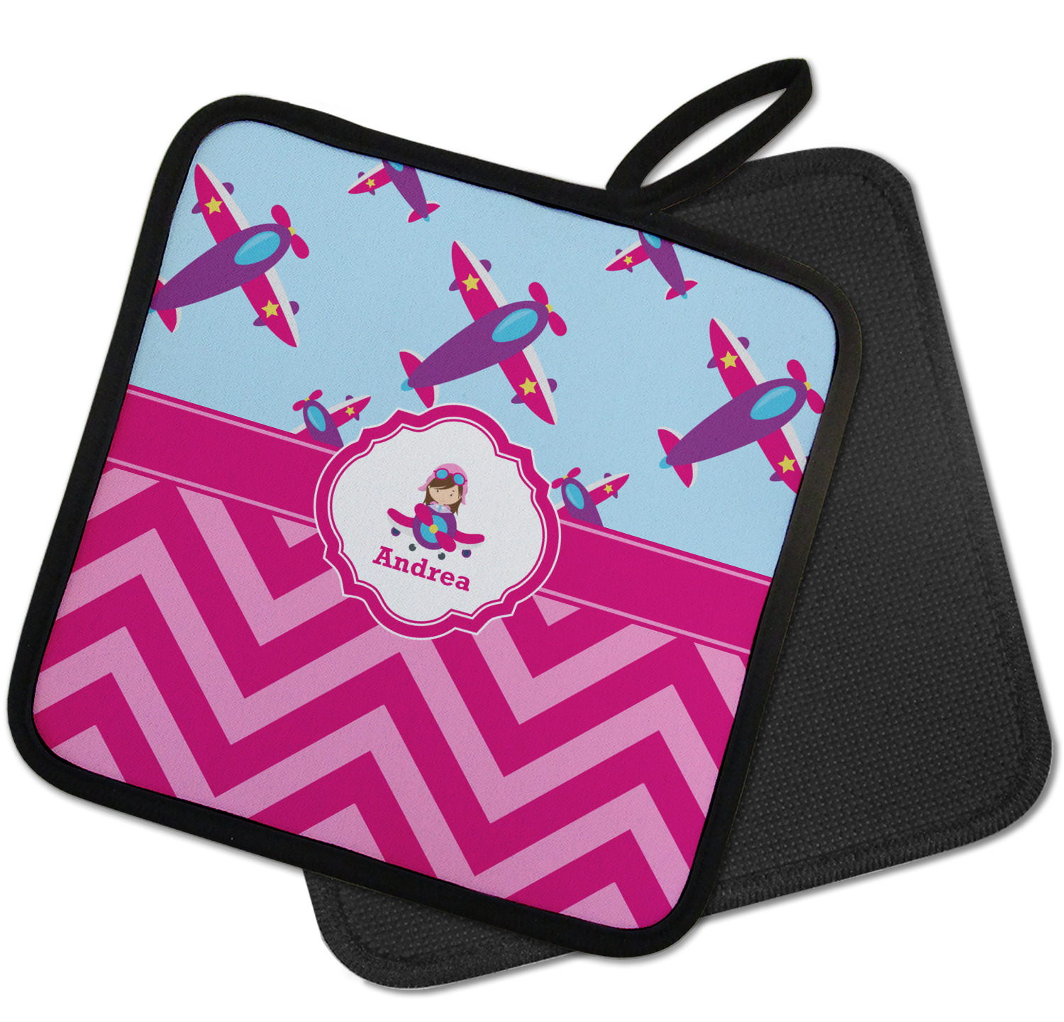 Our personalized pot holders feature a neoprene front that displays your personalization in vibrant colors. The backing of the hot pot holder is rubberized; the textured backing allows you to have a great grip when using this custom pot holder. The two materials are joined with a sleek, black trim, and the holder also includes an attached loop for hanging and storage. The pot holder is approximately 8.75 inches by 8.75 inches and 0.25 inches tall, while the fabric loop is 2.5 inches long. You can purchase a kitchen pot holder by itself or as a set of 2. We also offer a set including one pot holder and one oven mitt.